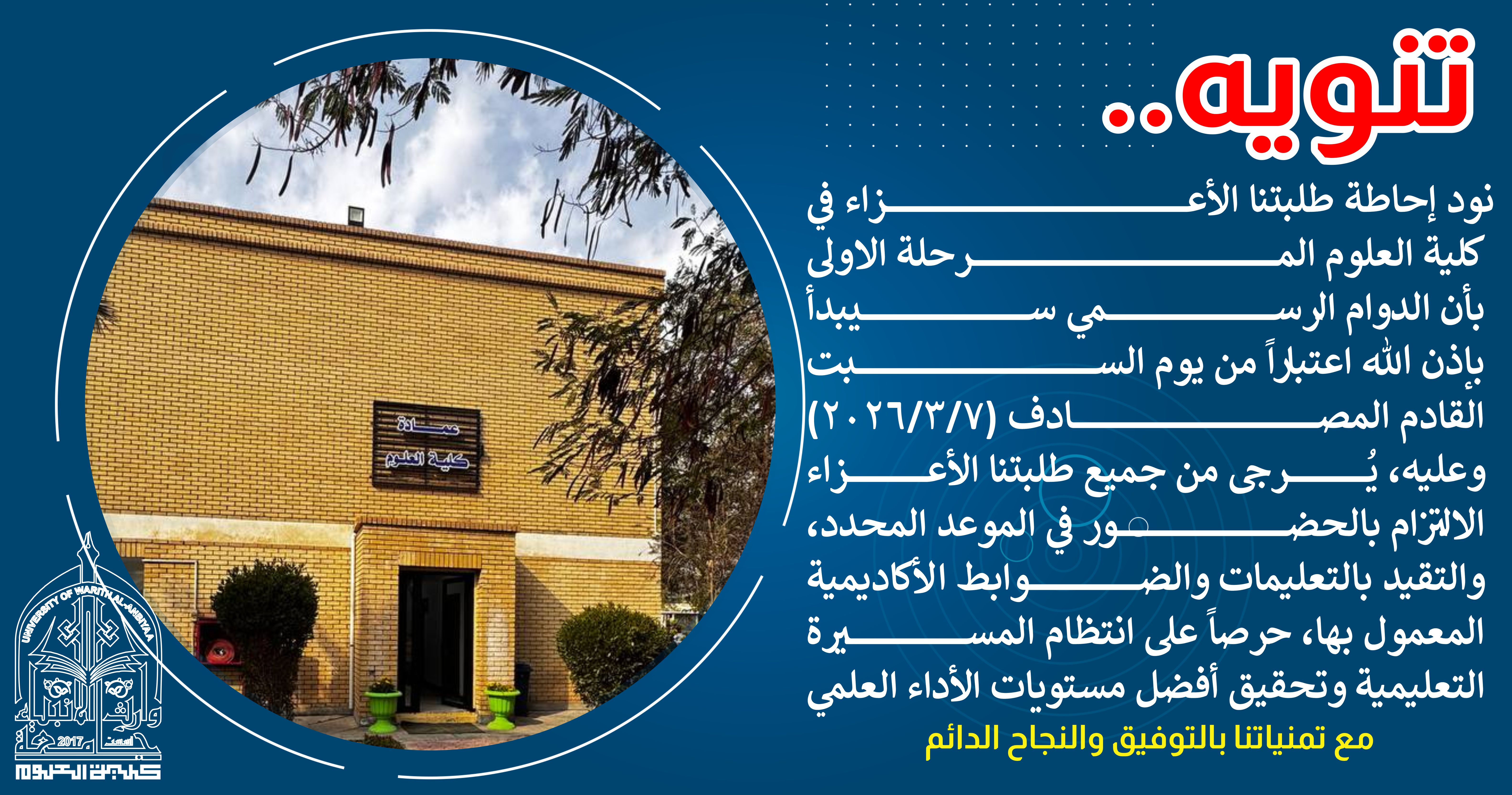 نود إحاطة طلبتنا الأعزاء في كلية العلوم المرحلة الاولى بأن الدوام الرسمي سيبدأ بإذن الله اعتباراً من يوم السبت القادم المصادف (2026/3/7)وعليه، يُرجى من جميع طلبتنا الأعزاء الالتزام بالحضور في الموعد المحدد،والتقيد بالتعليمات والضوابط الأكاديمية المعمول بها، حرصاً على انتظام المسيرة التعليمية وتحقيق أفضل مستويات الأداء العلمي