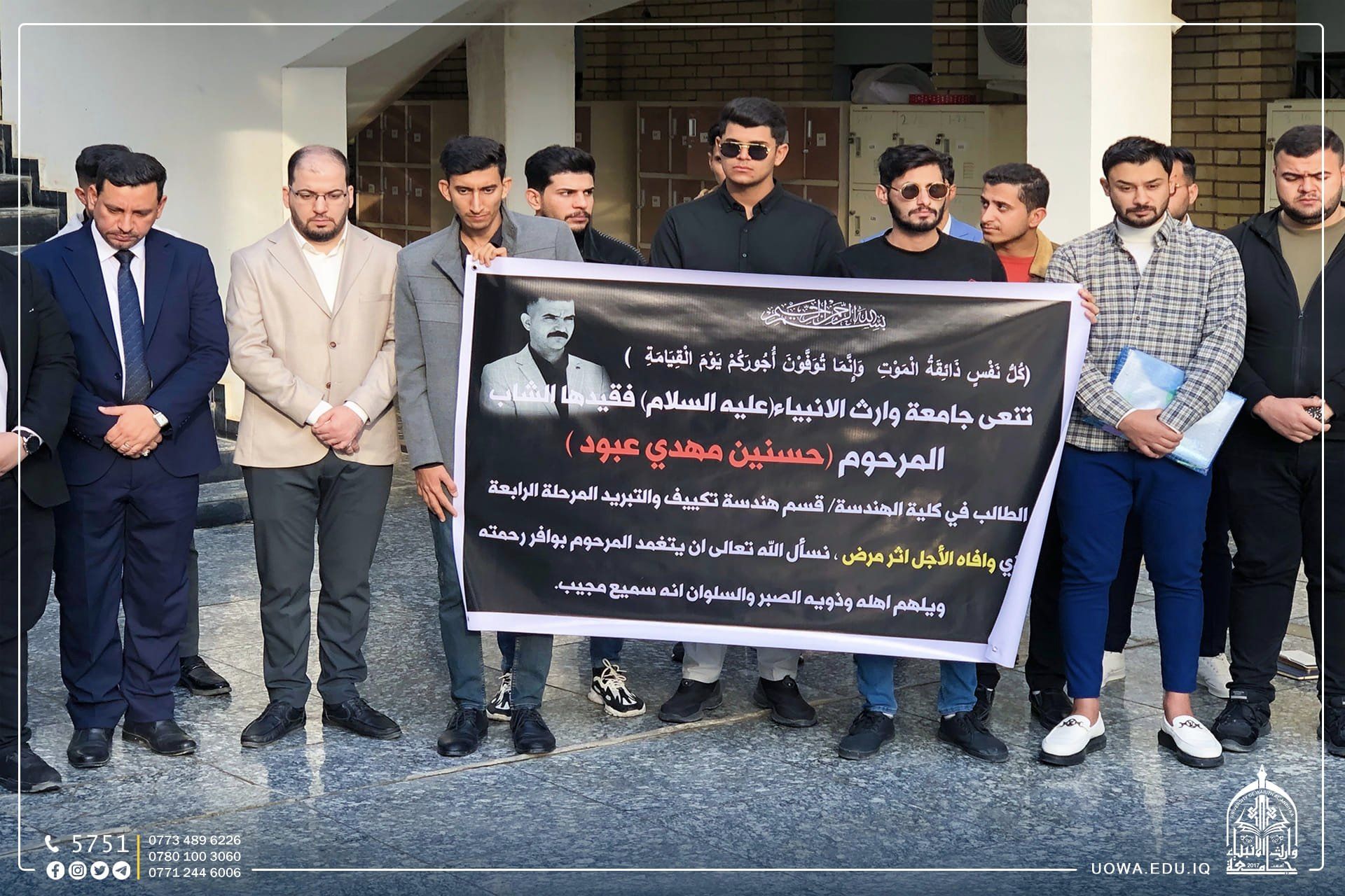 عمادة وطلبة كلية الهندسة ينظمون وقفة حداد وقراءة سورة الفاتحة على روح المرحوم الشاب (حسنين مهدي عبود) الطالب في قسم هندسة تقنيات التكييف والتبريد المرحلة الرابعة ، سائلين الله (عز وجل) ان يتغمده برحمته الواسعة ،ويلهم ذويه الصبر والسلوان.