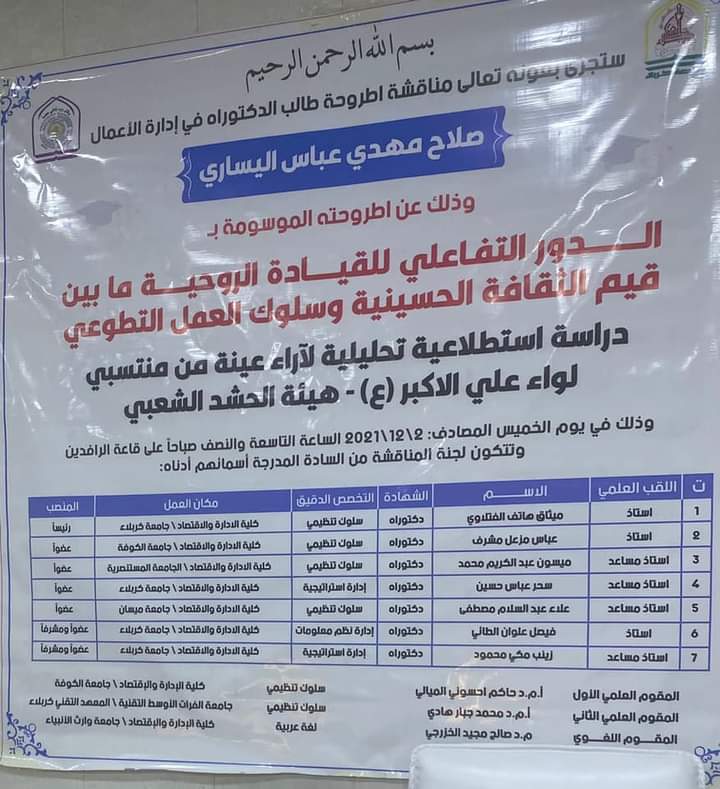 اذ تم بعون الله هذا اليوم الخميس الموافق 2/12/2021 مناقشة اطروحةالدكتوراه الموسومه (الدور التفاعلي للقياده الروحيه مابين قيم الثقافه الحسينيه وسلوك العمل التطوعي ) دراسة استطلاعية و تحليلية لاراء عينة من منتسبي لواء علي الاكبر (ع) - هيئة الحشد الشعبي، على قاعة الرافدين في كلية الادارة الاقتصاد / جامعة كربلاء. وقد تم قبول اطروحته بتقدير أمتياز مع مرتبة الشرف، وسط حضور رسمي واكاديمي واسع.