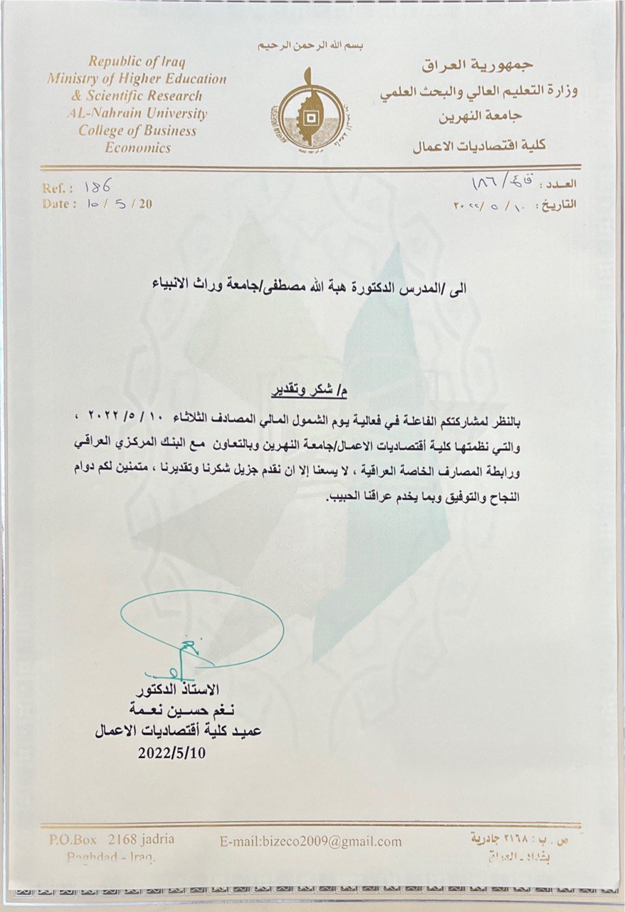 شارك السيد رئيس قسم المحاسبة المدرس دكتور هبة الله مصطفى السيد علي ، في فعالية يوم الشمول المالي، يوم الثلاثاء الموافق 2022/5/10 والتي نظمتها كلية اقتصاديات الاعمال / جامعة النهرين بالتعاون مع البنك المركزي العراقي ورابطة المصارف الخاصة العراقية.