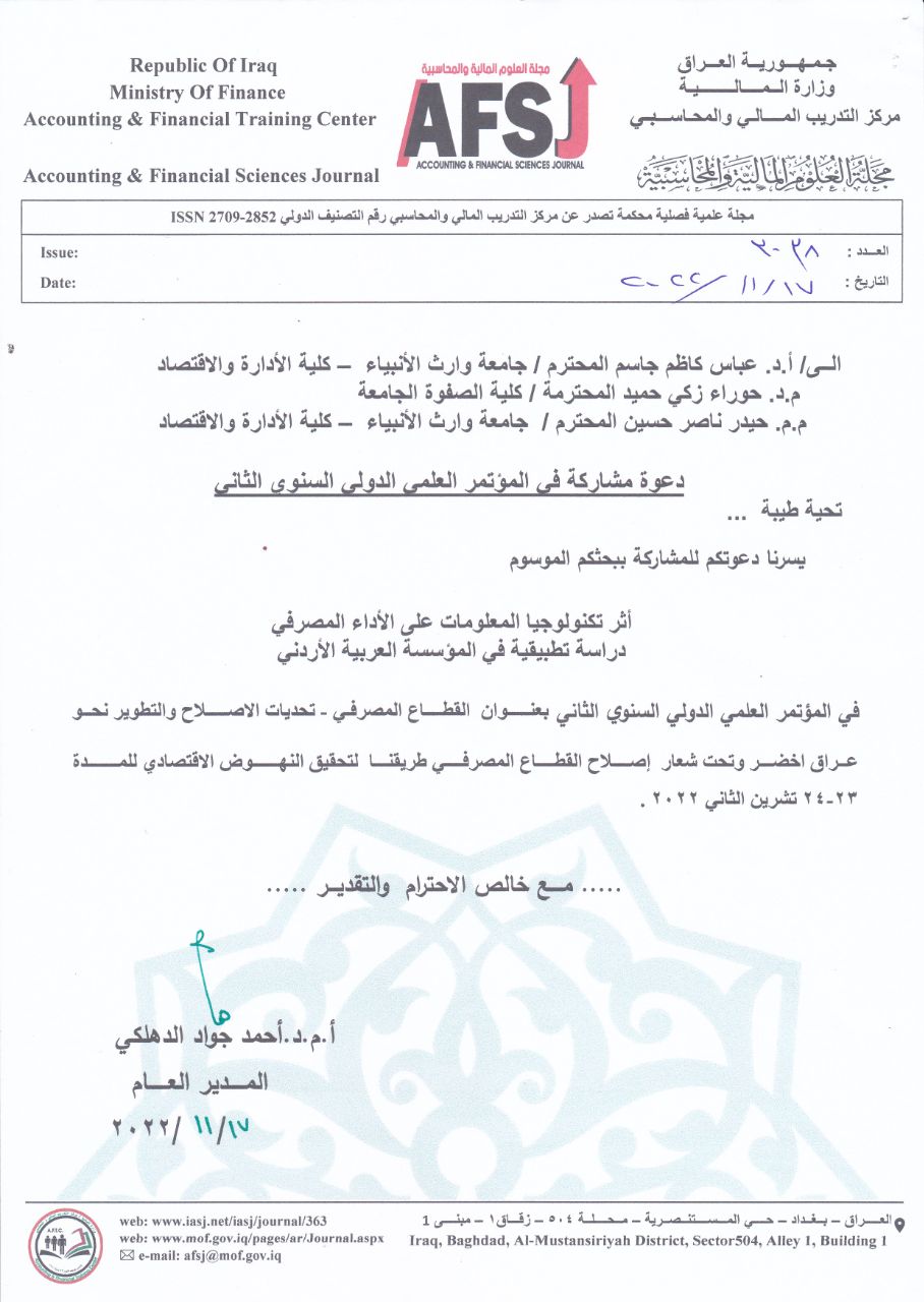 تدريسي في كلية الادارة والاقتصاد / جامعة وارث الانبياء.ع. يشارك في مؤتمر علمي دولي في وزارة المالية العراقية.