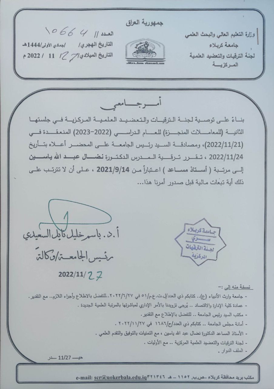 يسر عمادة كلية الادارة والاقتصاد ان تتقدم الى السيدة (أ.م.د نضال عبدالله ياسين المالكي) بأزكى التبريكات بمناسبة ترقيتها الى مرتبة استاذ مساعد، نسأل الله ان يمدها بالمزيد من التقدم والتوفيق والله ولي التوفيق