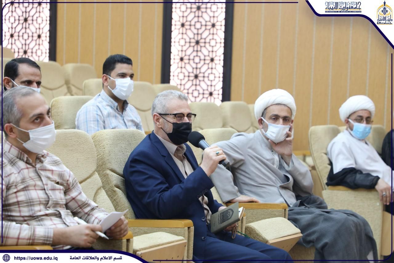 حرصًا من رئيس جامعة وارث الأنبياء "ع" الأستاذ الدكتور (طالب حسن موسى) لسير العملية التعليمية والمحافظة على مكانة الجامعة العلمية ومتابعة الأداء التعليمي لكوادرها التدريسية والنظر في مستقبل طلبتنا في المحافظة على جوهرهم العلمي  في عدم الانسياق  وراء الطرح الفكري غير المدروس والفاقد للبعد العلمي والخالي من رؤية المستقبل والتطلعات والتوجهات البناءة، التقى رئيس الجامعة ومساعديه الإداري الأستاذ الدكتور (نوفل الأعرجي) والأستاذ الدكتور (عباس الدعمي) بكلية العلوم الإسلامية بعمادتها ورئيسي قسميها والملاك التدريسي فيها، في يوم الاثنين الموافق 26/ 4/ 2021، في (قاعة العلى). باجتماع نستطيع تسميته بـ ( لقاء الحرص والاهتمام  في النظر إلى مصلحة الجامعة وأساتيذها وطلابها).