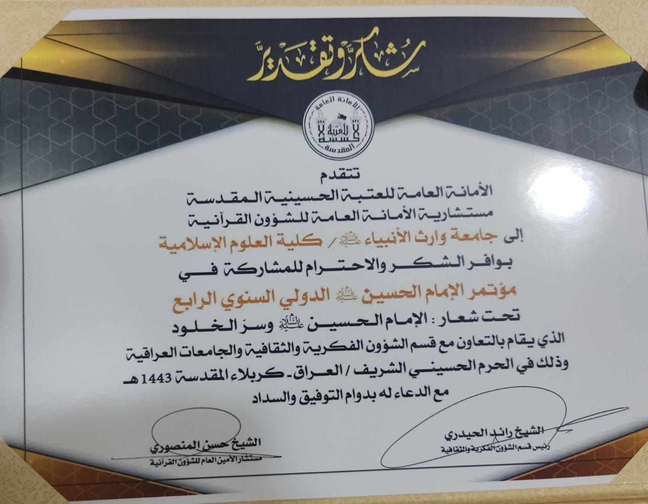 تتقدم مستشارية الأمانة العامة للشؤون القرآنية / العتبة الحسينية المقدسة بوافر شكرها وتقديرها إلى جامعة وارث الأنبياء / كلية العلوم الإسلامية المتمثلة باساتيذها الأجلاء لمشاركتهم الفاعلة في مؤتمر(  الإمام الحسين عليه السلام) الذي أقامته العتبة الحسينية المقدسة بالتعاون مع قسم الشؤون الفكرية والثقافية والجامعات العراقية في الحرم الحسيني المقدس