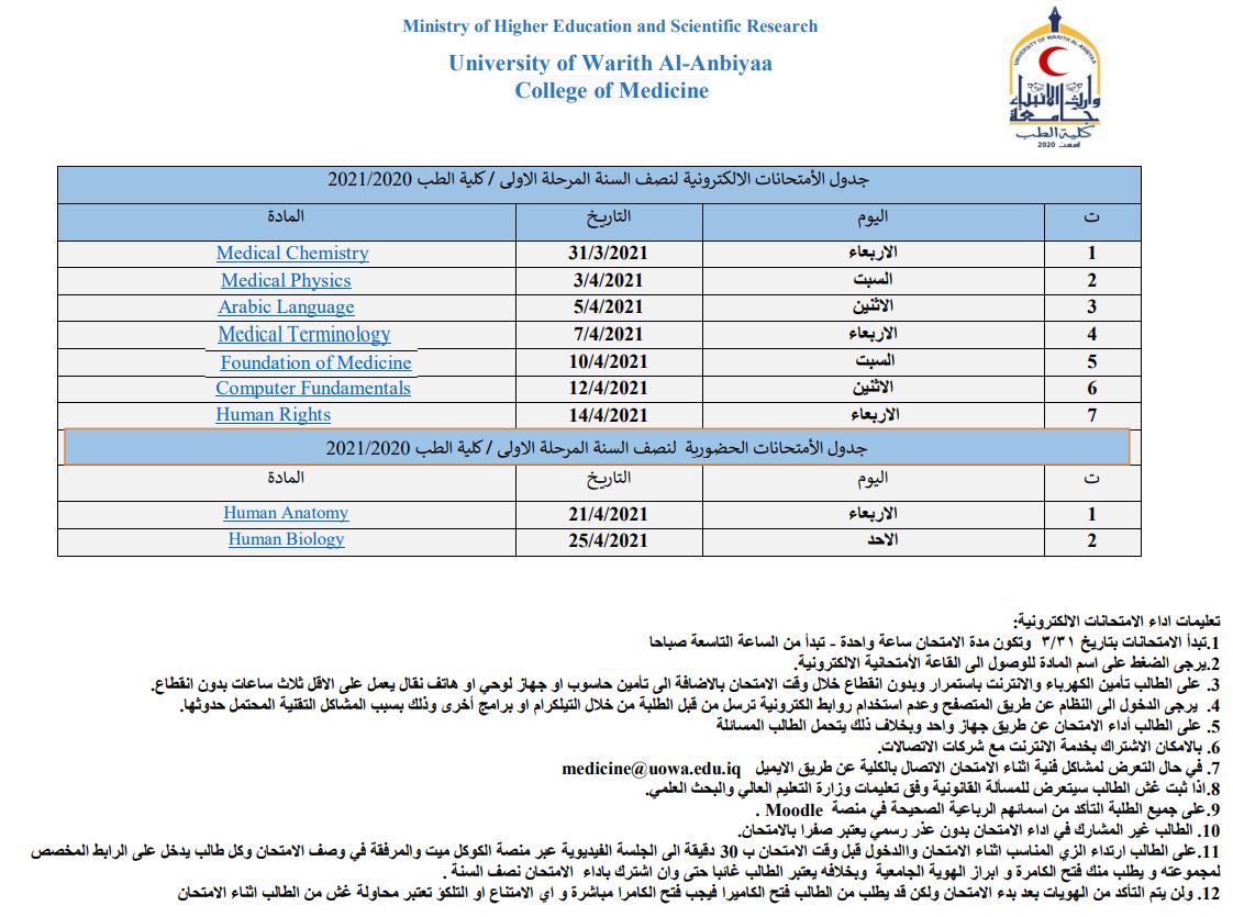 جدول الامتحان نصف السنة / كلية ألطب