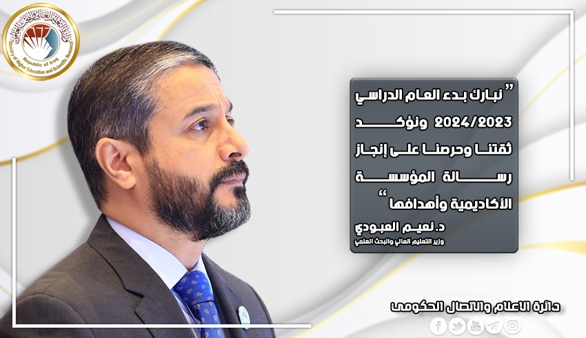 نعلن على بركة الله بدء العام الدراسي 2024/2023 في الجامعات العراقية كافة ونبارك للهيئات التدريسية وأبنائنا الطلبة شروعهم في أداء مسؤولياتهم التعليمية ونؤكد ثقتنا وحرصنا على إنجاز رسالة المؤسسة الأكاديمية وأهدافها في تقديم الخدمات التخصصية ذات الجودة والاستجابة لمتطلبات التنمية.
