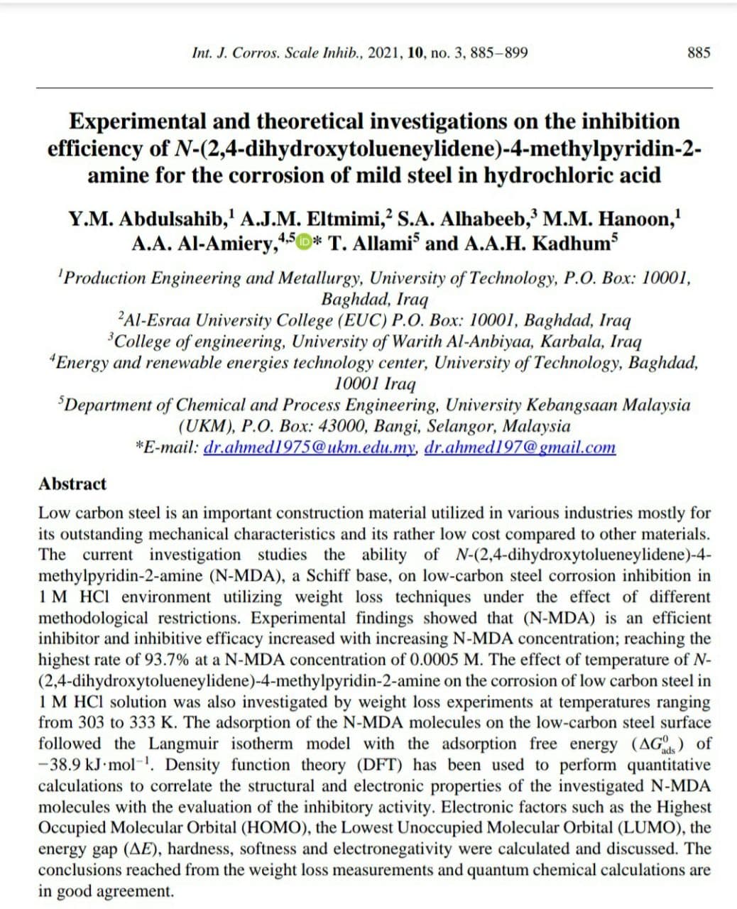 نشرت التدريسية م.م. سكينة عبد الفتاح الحبيب من كلية الهندسة/ قسم هندسة التكييف والتبريد بحثاً علمياً جديداً يضاف إلى البحوث العلمية المتميزة التي تميزت بها كلية الهندسة في جامعة وارث الانبياء(عليه السلام)في مجلة International journal of Corrosion and Scale Inhibition)البحث المنشور هو ضمن تخصص هندسة المواد وهو عبارة عن دراسة عملية ونظرية عن تأثير إضافة بعض المركبات والمحاليل الكيمياوية على تآكل عنصر سبيكة الحديد وإمكانية زيادة الكفاءة لهذه المواد وتقليل نسبة التاكل، البحث منشور في مجلة علمية رصينة ضمن قاعدة بيانات سكوباس Q2 ..وبمشاركة نخبة من الباحثين المتميزين من داخل وخارج العراق.