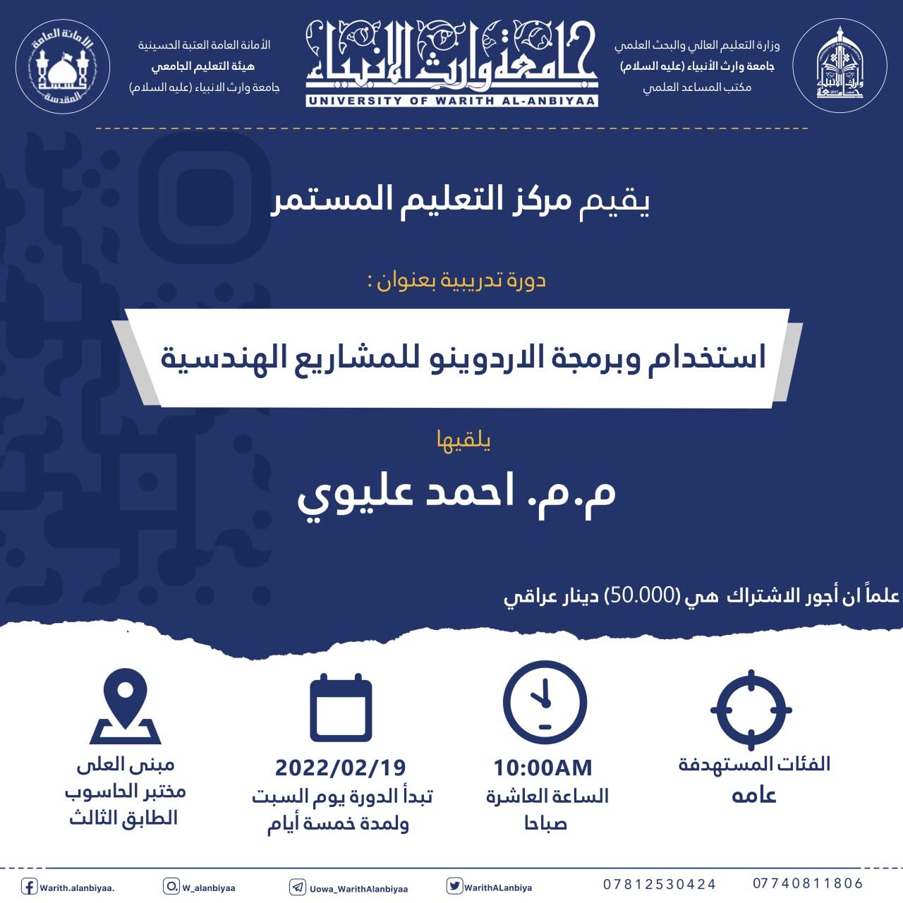 يهديكم مركز التعليم المستمر في جامعة وارث الأنبياء (عليه السلام) اطيب التحيات ، نود اعلامكم عن اقامة المركز دورة تدريبية بعنوان (استخدام وبرمجة الاردوينو للمشاريع الهندسية) والتي تعقد ابتداءً من يوم السبت الموافق 19/2/2022 ولمدة خمسة أيام. تلقى الدورة حضورياً في بناية العلى/مختبر الحاسوب/ الطابق الثالث في تمام الساعة (10:00) صباحاً. يحاضر في الدورة المتخصص في مجال هندسة الحاسبات المهندس (م.م. احمد عليوي).تستهدف الدورة طلبة كلية الهندسة والراغبين في تطوير مهاراتهم في استخدام وبرمجة الاردوينو.للاشتراك في الدورة يرجى زيارة الرابط التالي ( https://bit.ly/3pQ2Zgk ).علماً ان أجور الاشتراك هي (50,000) دينار عراقي ( خمسون الف دينار عراقي).