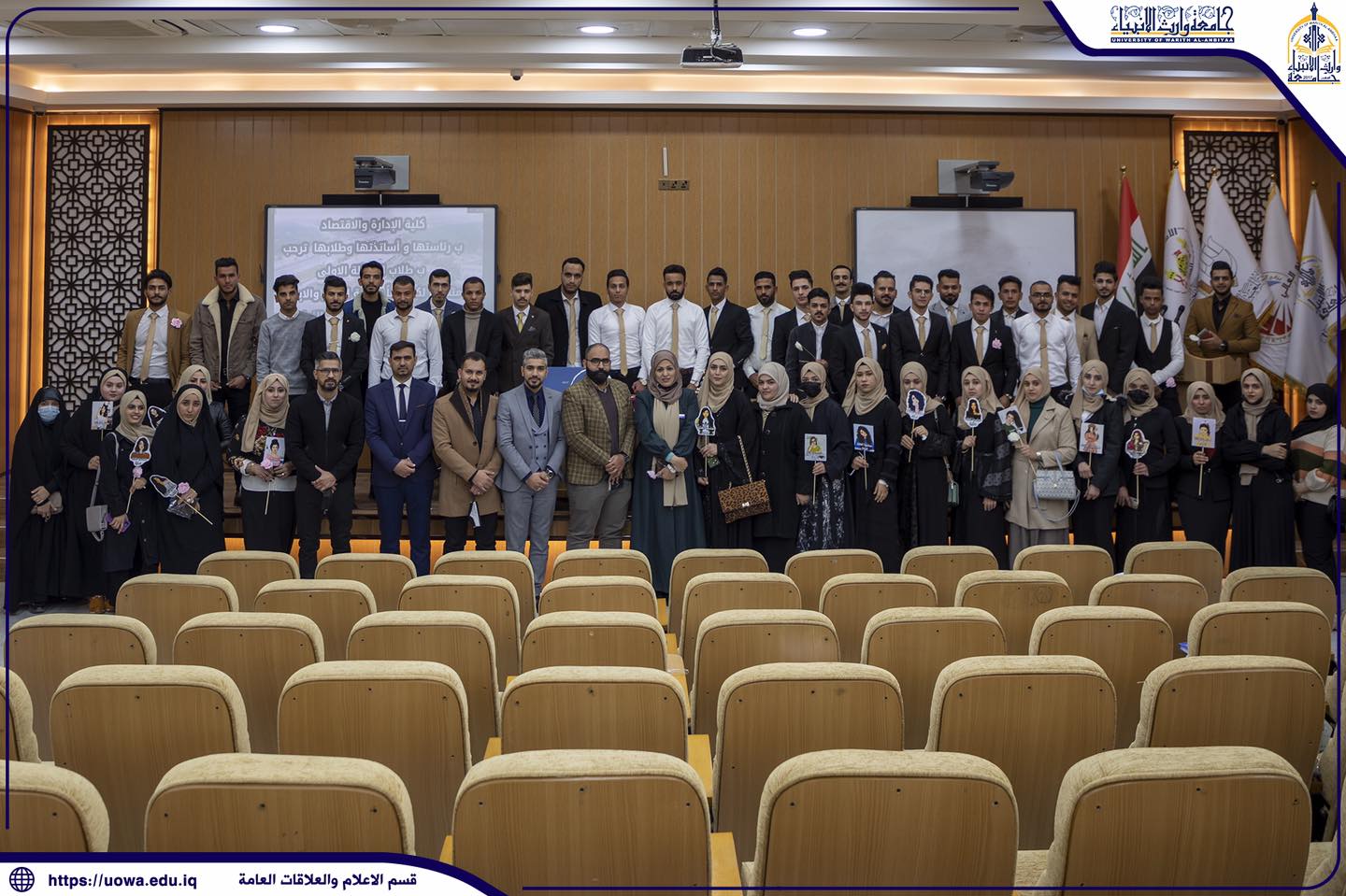 بحضور كل من السيد رئيس الجامعة أ.د ابراهيم المحياوي والاستاذ الدكتور نوفل الاعرجي المساعد الاداري لرئيس الجامعة والسادة العمداء الاستاذ الدكتور عواد الخالدي عميد كلية الادارة والاقتصاد والاستاذ المساعد الدكتور علي الشريفي عميد كلية القانون والسيد المعاون العلمي لكليه الادارة والاقتصاد د.فهد الشمري والسيدة رئيسه قسم المحاسبة الدكتورة هبة الله والسيد مقرر قسم المحاسبة م.علي محمد الكيشوان والسادة التدريسين اقامت كلية الادارة والاقتصاد جامعة وارث الأنبياء حفل ترحيب للطلبة الجدد لقسم المحاسبة للعام الدراسي ٢٠٢١-٢٠٢٢ متمنين لهم دوام الصحة والعافية