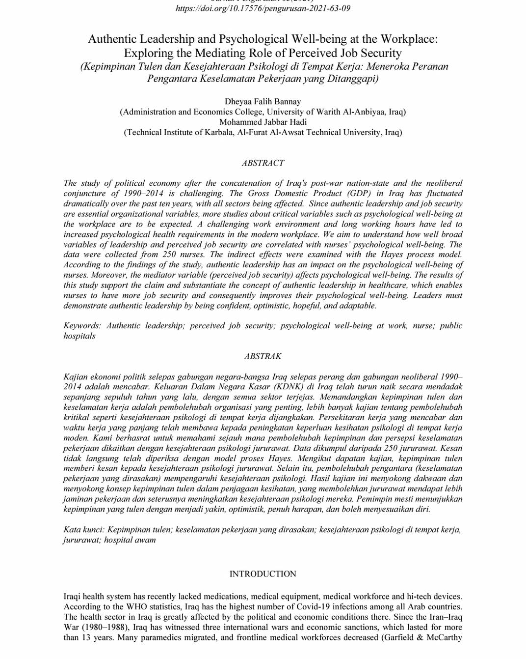 نشر الباحث والاكاديمي في كلية الإدارة والاقتصاد الدكتور ضياء البناي بحثاً علمياً في المجلة الماليزية ( Jurnal Pengurusan UKM)التي تعتبر واحدة من أفضل المجلات الماليزية وتقع ضمن مستوعبات سكوبس وقال الدكتور ضياء البناي: "أن البحث يخوض في التفاعل الممكن حدوثه بين ثلاثة متغيرات مهمة في مجال الإدارة، و حقل السلوك التنظيمي في ظل جائحة كورونا بين عينة من الممرضين : القيادة الاصيلة (والتي قد تسمى القيادة الحقيقة )، الرفاهية النفسية في مكان العمل، الامن الوظيفي المتصور" .