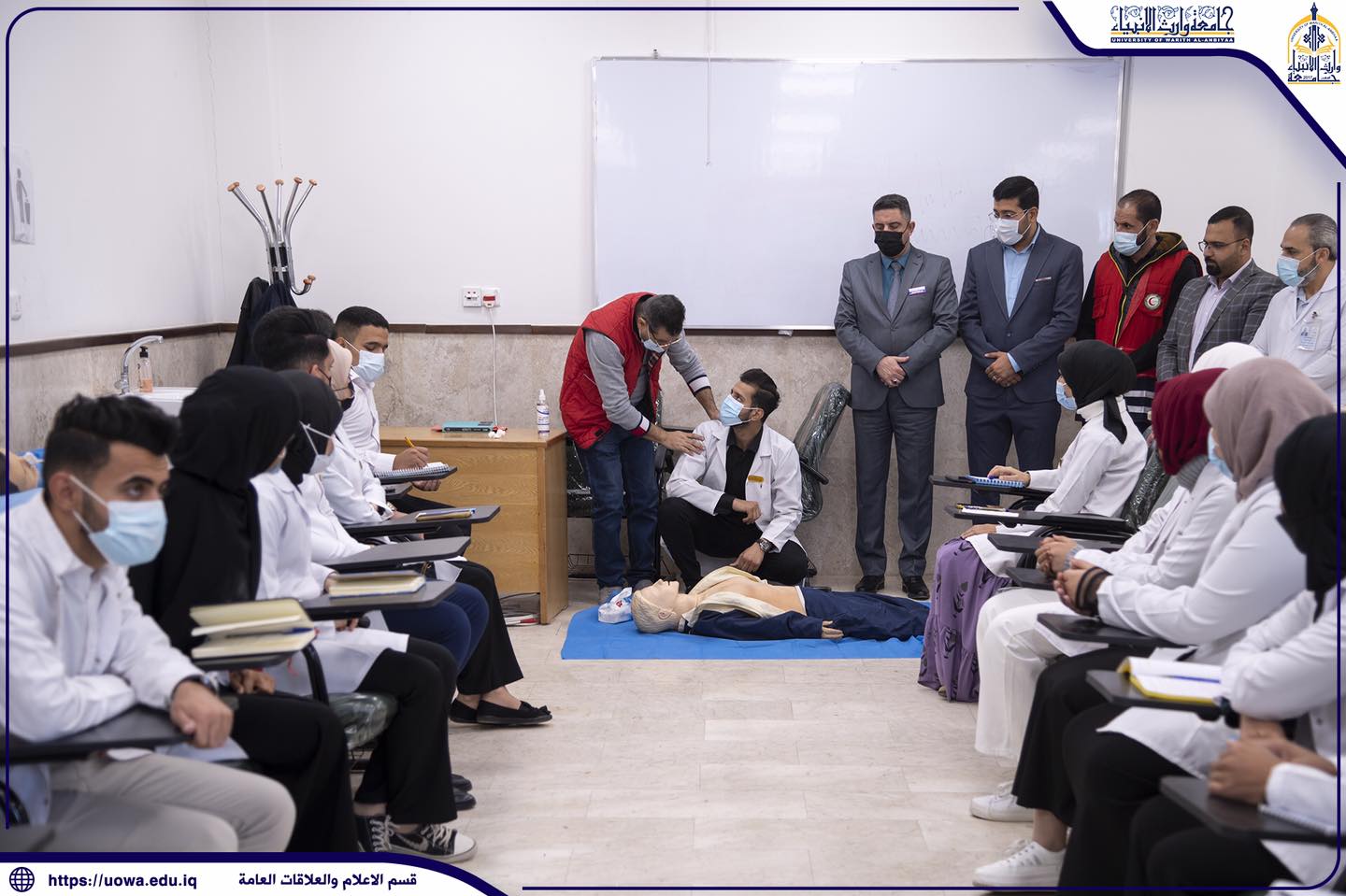 نظمت كلية التمريض في جامعة وارث الانبياء(عليه السلام) وبالتنسيق مع جمعية الهلال الأحمر العراقي فرع كربلاء المقدسة ورشة عمل تدريبية لاساتذة ومنتسبي الكلية والطلبة في الأسعافات الأولية ، وتضمنت الورشة تدريب المشاركين على كيفية اسعاف المرضى والجرحى في الحالات الطارئة والحوادث وماهي الحالات البديلة قبل نقل المريض الى المستشفى في الدقائق الأولى من الأصابة والتي شملت كافة الخطوات الواجب القيام بها للتعامل مع هذه الحالات بالشكل المبسط وبتطبيق عملي لتسهيل التعلم والتصرف بحكمة لتفادي هذه المشاكل مثل حالات (الاختناق , الغرق , الحريق , والانفجارات) والحالات الاضطرارية كحالات فقدان الوعي ، والتعامل مع كل حالة بشكل يختلف عن الاخر فضلاً عن التدريب على مبادئ الاسعافات الاولية في الحالات الطارئة حيث أنه من الضروري تدريب الجميع على الاسعافات الاولية لأنها تعد الطريقة المثلى لإنقاذ حياة المواطنين في الدقائق الاولى لوقوع الحادث والتي تعد الدقائق الذهبية لأنقاذ حياة المصاب.