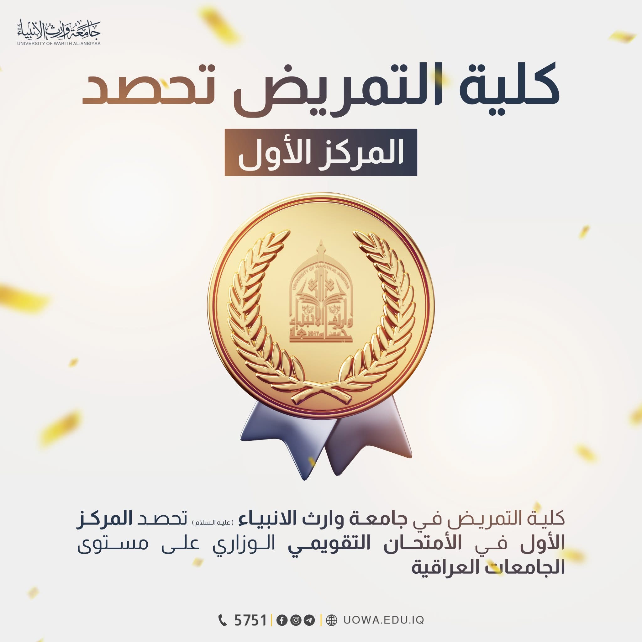 حققت كلية التمريض في جامعة وارث الأنبياء(عليه السلام) المركز الأول في نسب النجاح بالامتحان التقويمي للعام 2024–2025، وذلك وفقا للتقرير الرسمي الصادر عن وزارة التعليم العالي والبحث العلمي.