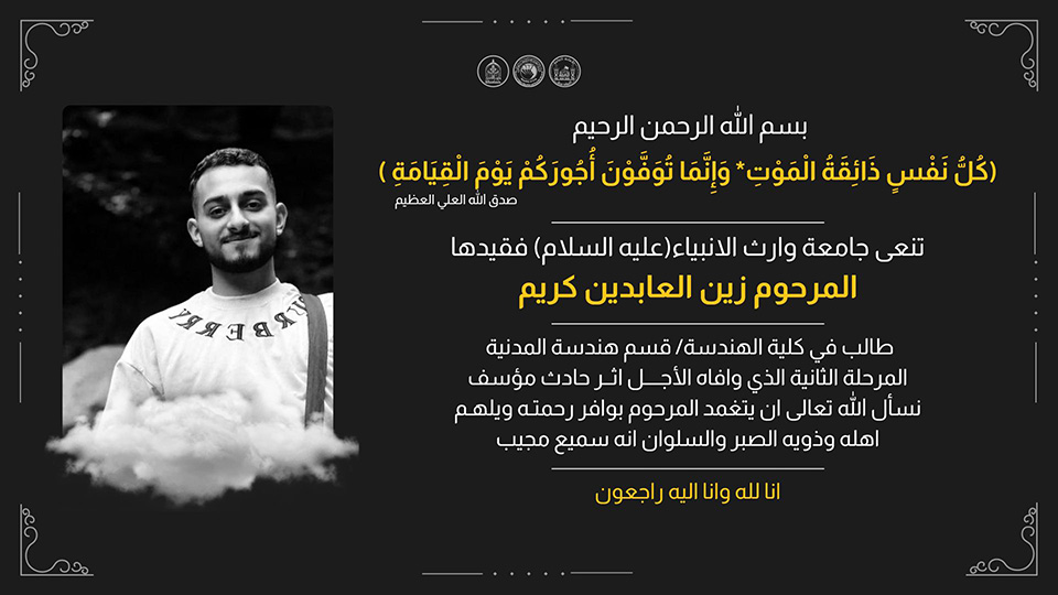 جامعة وارث تنعى فقيدها طالب كلية الهندسة الذي توفي إثر حادث مؤسف