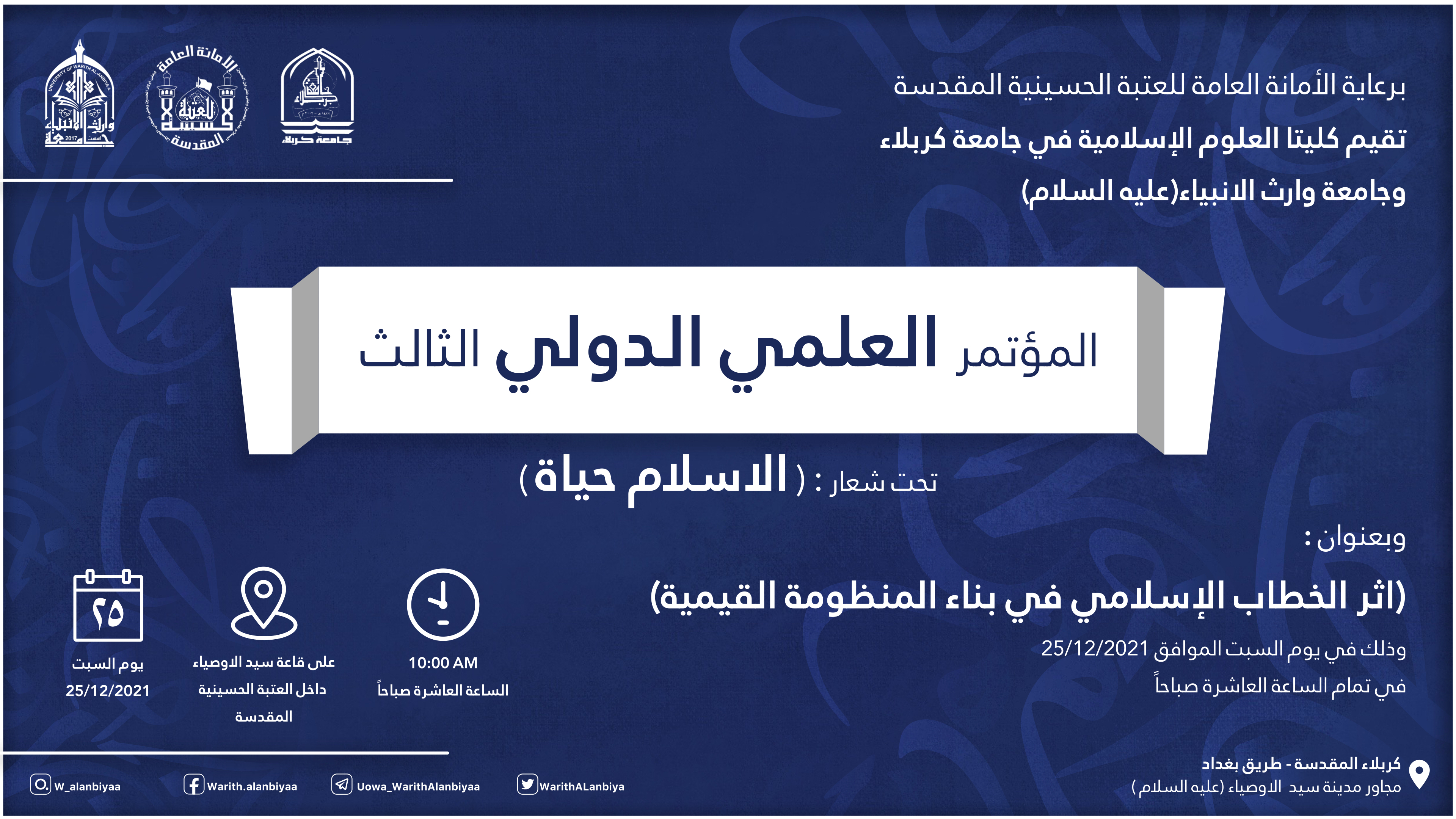 تحت شعار (الاسلام حياة)، تقيم كليتا العلوم الاسلامية في جامعة كربلاء وجامعة وارث الانبياء (عليه السلام) المؤتمر العلمي الدولي الثالث بعنوان (أثر الخطاب الاسلامي في بناء المنظومة القيمية)