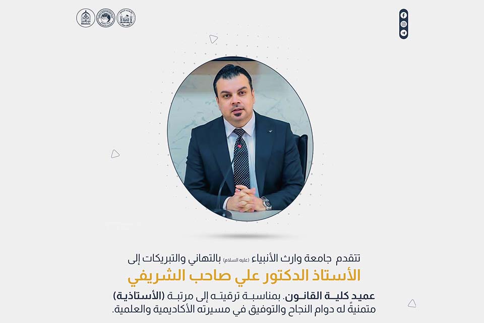 تقدمت جامعة وارث الأنبياء (عليه السلام) بأسمى التهاني والتبريكات إلى الأستاذ الدكتور علي صاحب الشريفي، عميد كلية القانون، بمناسبة ترقيته إلى مرتبة (الأستاذية).