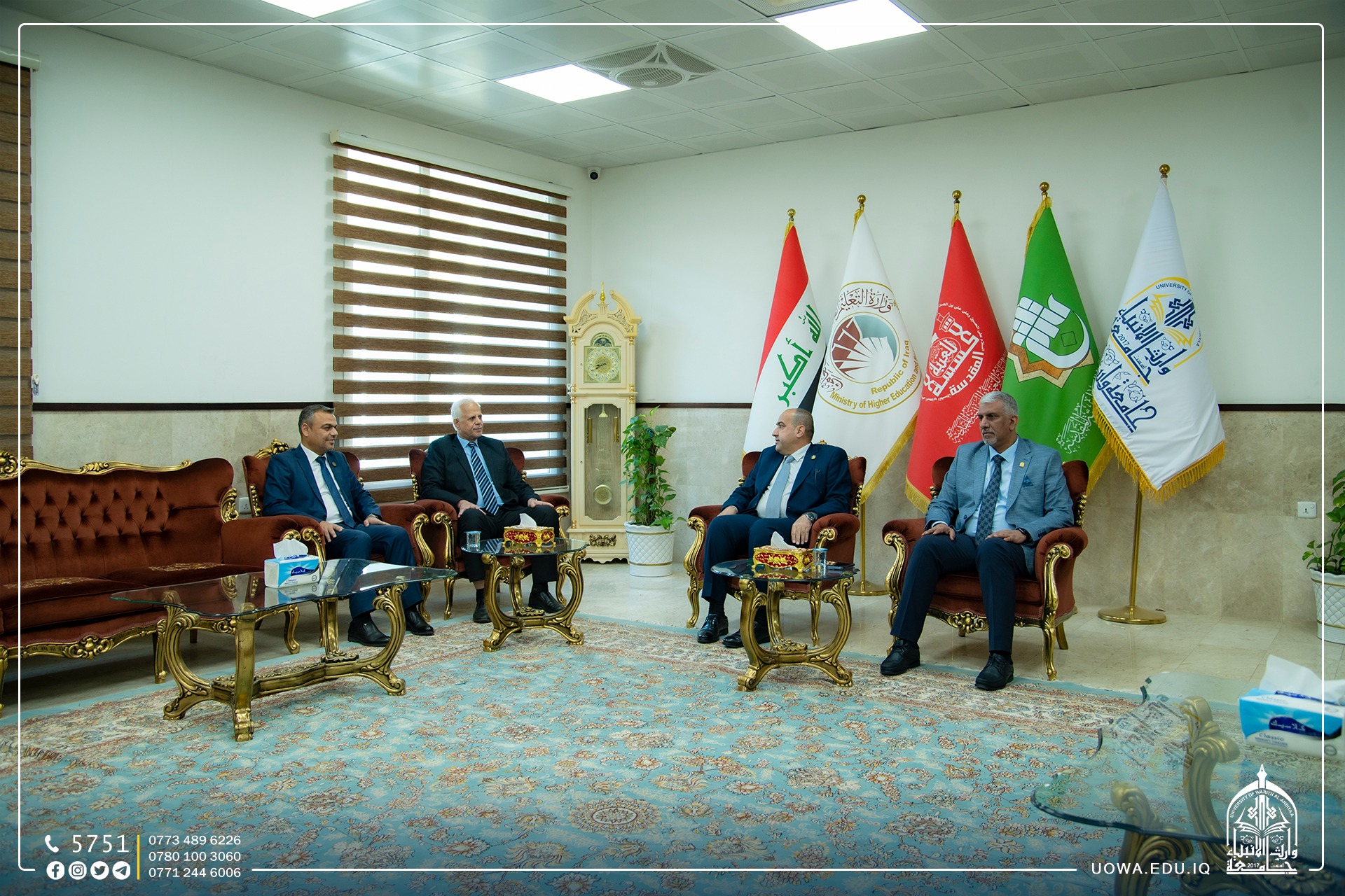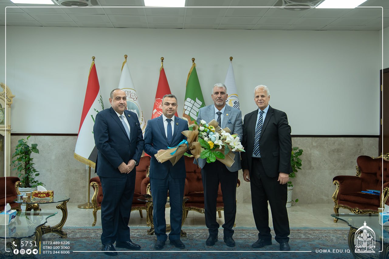 استقبل رئيس الجامعة الاستاذ الدكتور ابراهيم الحياوي، رئيس جامعة كربلاء الاستاذ الدكتور باسم خليل السعيدي، يرافقه المساعد الإداري الاستاذ الدكتور اكرم الياسري الذين زار الجامعة لتقديم التهاني للاستاذ الدكتور واقد الموسوي بمناسبة تسنمه مهام مساعد رئيس الجامعة للشؤون العلمية سائلًا الله عزوجل له الاستمرار في طريق العلم وخدمته لسالكيه وقاصديه وفاء لعراقنا الحبيب.