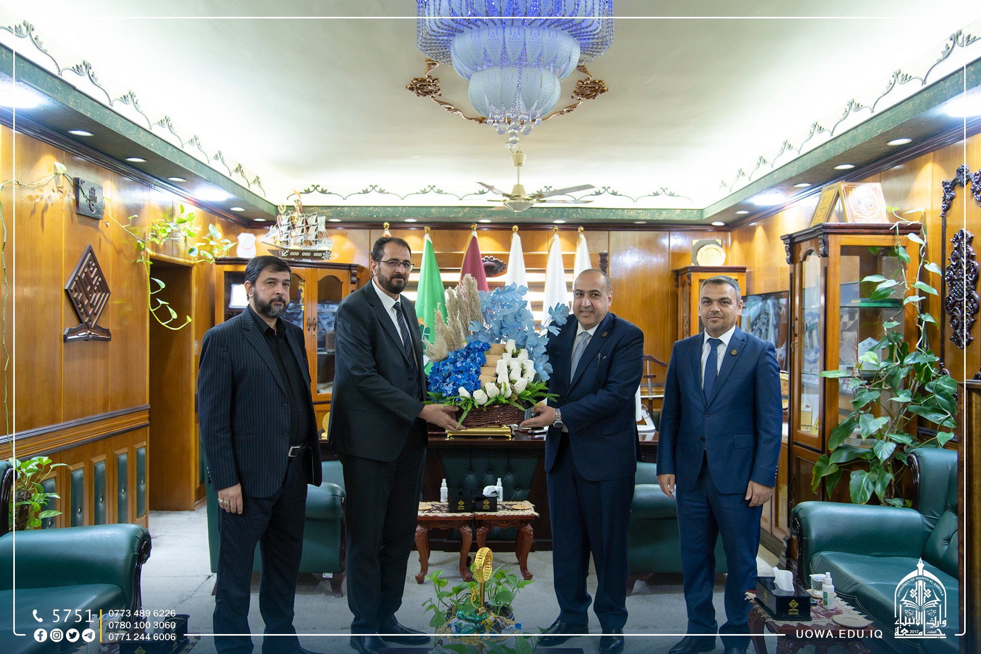 استقبل رئيس الجامعة الأستاذ الدكتور ابراهيم الحياوي، رئيس جامعة كربلاء الأستاذ الدكتور باسم خليل السعيدي، يرافقه المساعد الإداري الأستاذ الدكتور أكرم الياسري، اللذان زارا الجامعة لتقديم التهائي والتبريكات الى الأستاذ المساعد الدكتور حسين هادي حسين بمناسبة تسنّمه عمادة كليّة الهندسة، سائلاً الله عزّ وجل الموفقية له لخدمة المسيرة العلميّة في بلدنا العزيز.