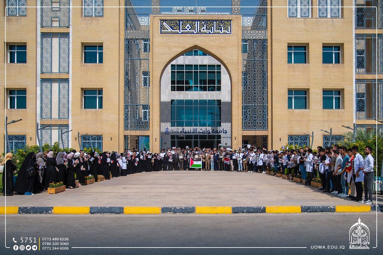 جامعة وارث الانبياء(عليه السلام) تنظم وقفة تضامنية مع الشعب الفلسطيني، وتؤكد مساندتها للشعب الفلسطيني الأبيّ في مقاومته الباسلة للمحتلين، وإن العالم كله مدعوّ للوقوف في وجه هذا التوحش الفظيع ومنع تمادي قوات الاحتلال عن تنفيذ مخططاتها لإلحاق مزيد من الأذى بالشعب الفلسطيني المظلوم، ويجري هذا بمرأى ومسمع العالم كله ولا رادع ولا مانع، بل هناك من يساند هذه الأعمال الإجرامية ويبرّرها بذريعة الدفاع عن النفس!