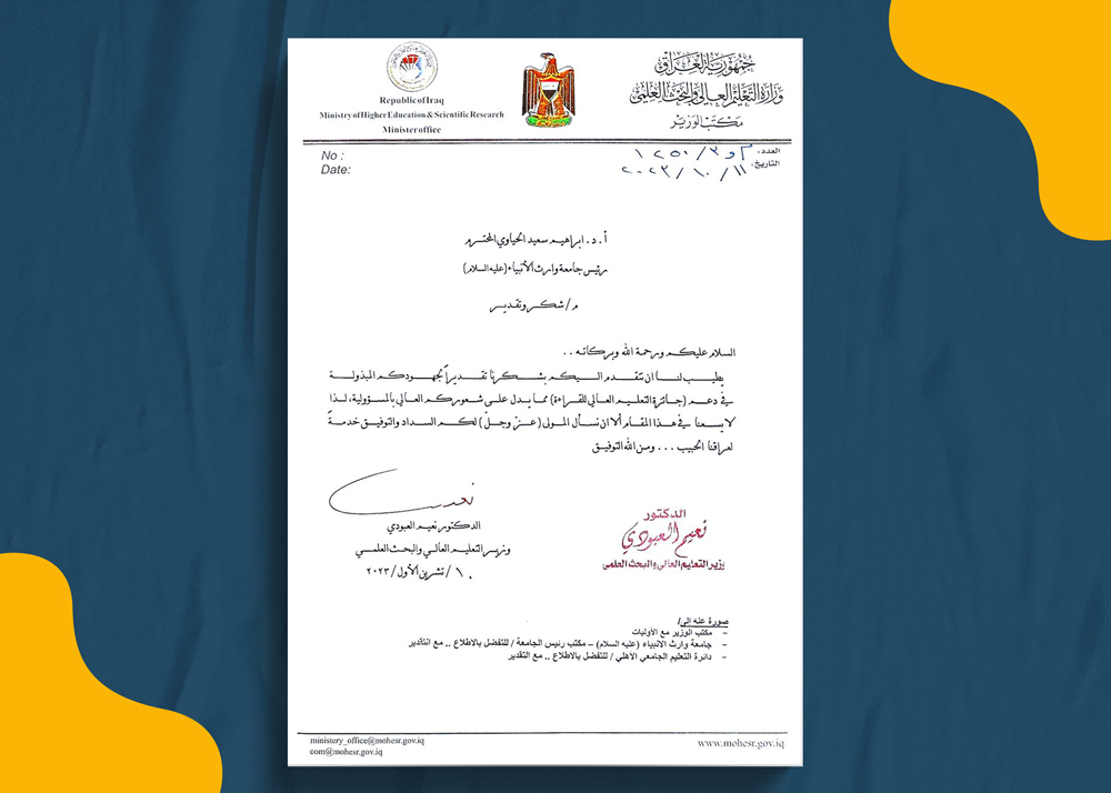 قدم وزير التعليم العالي والبحث العلمي الدكتور نعيم العبودي "كتاب شكر وتقدير" الى الاستاذ الدكتور ابراهيم الحياوي رئيس جامعة وارث الأنبياء (علية السلام)، لجهوده المبذولة في دعم (جائزة التعليم العالي للقراءة).