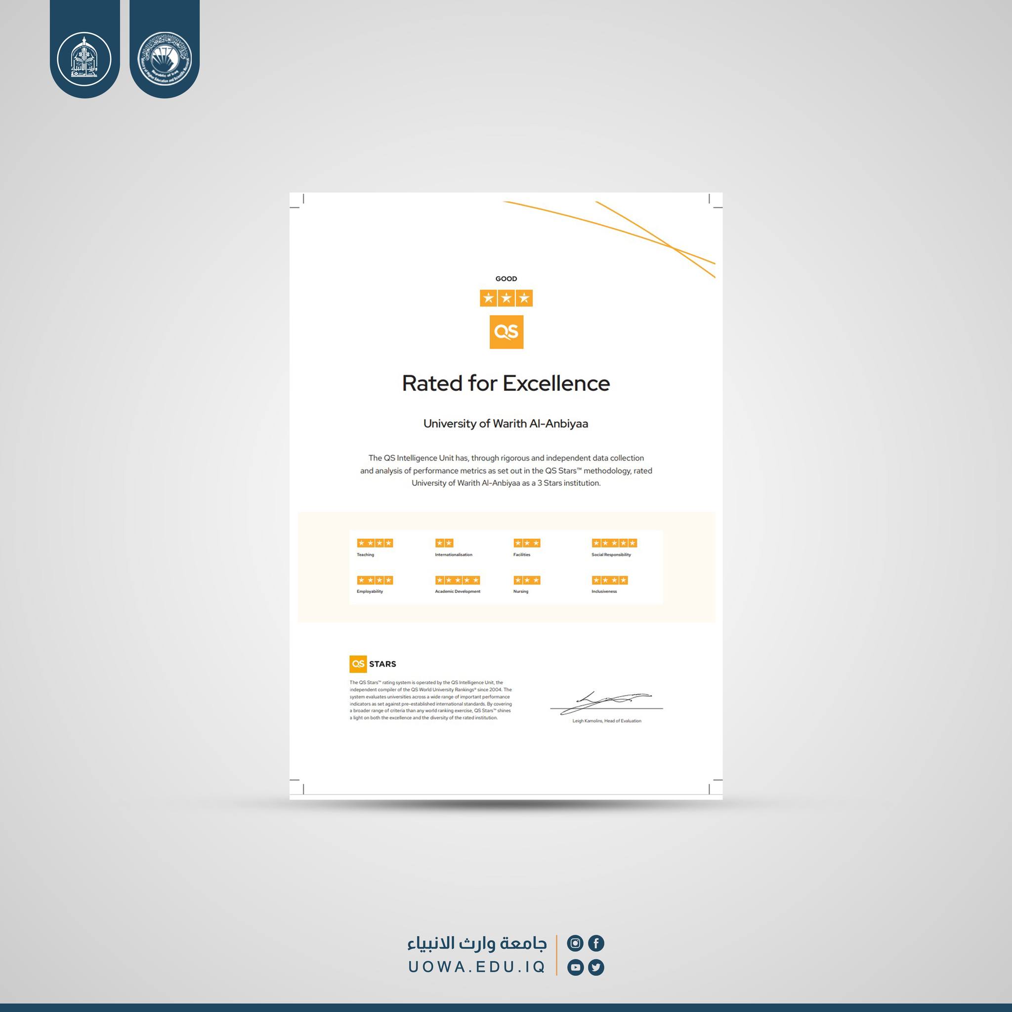 يذكر أن جامعة وارث الأنبياء (عليه السلام) تحث الخطى لمواكبة الواقع التعليمي الرصين عبر دخول التصنيفات العالمية من خلال عقد الشراكات والتوأمات مع الجامعات العريقة محلياً وعربياً وعالمياً.