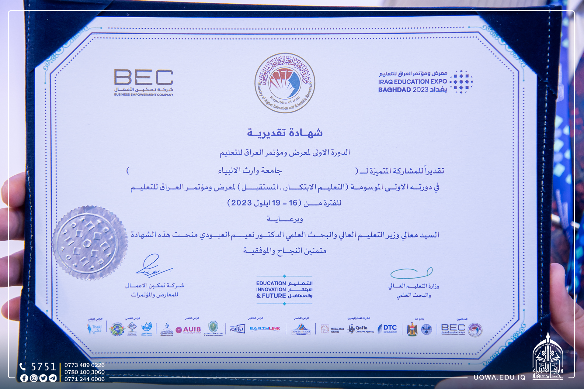 كرمت وزراة التعليم العالي والبحث العلمي جامعة وارث الأنبياء عند ختام النسخة الاولى من " معرض ومؤتمر العراق للتعليم" ، وجاء هذا التكريم تثميناً لجهود الجامعة المتميزة ومشاركتها المثمرة في فعاليات وانشطة المعرض.