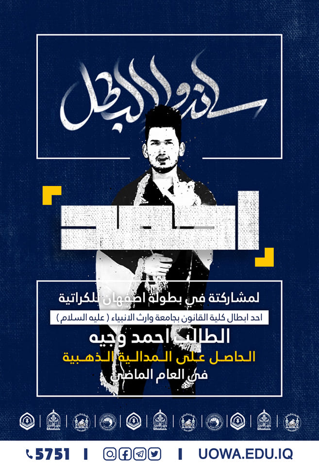 وصل الطالب احمد وجيه محمد من كلية القانون الذي مثل جامعة وارث الانبياء عليه السلام" مع الوفد المرافق له الى مدينة أصفهان في إيران، للمشاركة في بطولة اصفهان للكراتيه.