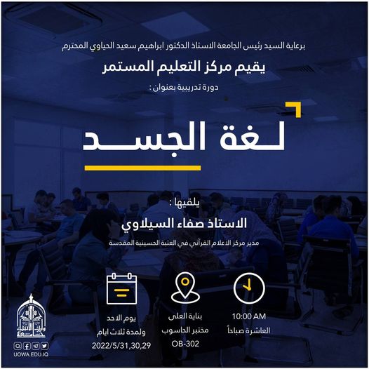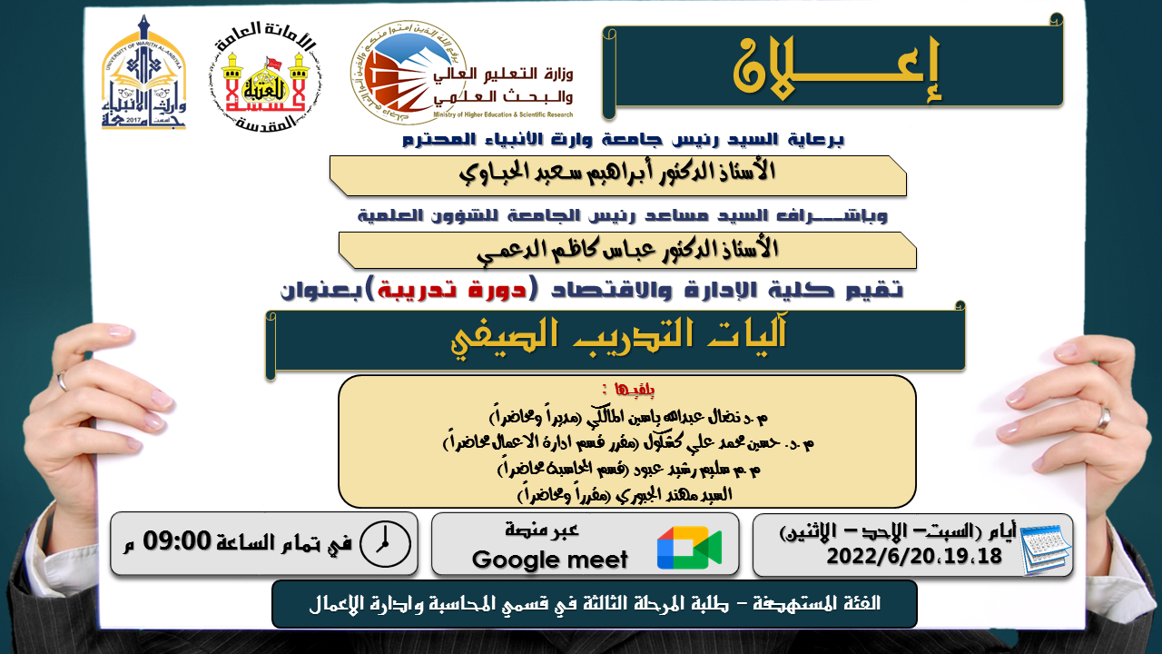 يقيم مركز التعليم المستمر في جامعة وارث الانبياء (عليه السلام) بالتعاون مع كلية الادارة والاقتصاد دورة تدريبية بعنوان "آليات التدريب الصيفي"، والقائمين بالدورة السادة:- م.د نضال عبدالله ياسين المالكي (مديراً ومحاضراً)- م.د. حسين محمد علي كشكول (مقرر قسم ادارة الاعمال محاضراً)- م.م سليم رشيد عبود (قسم المحاسبة محاضراً)- السيد مهند الجبوري (مقرراً ومحاضراً)اعتبارا من يوم السبت الموافق 6/18/ 2022 ولمدة ثلاثة أيام وتقام الكترونياً على منصة Google Meet وفي تمام الساعة 9:00 مساءً.