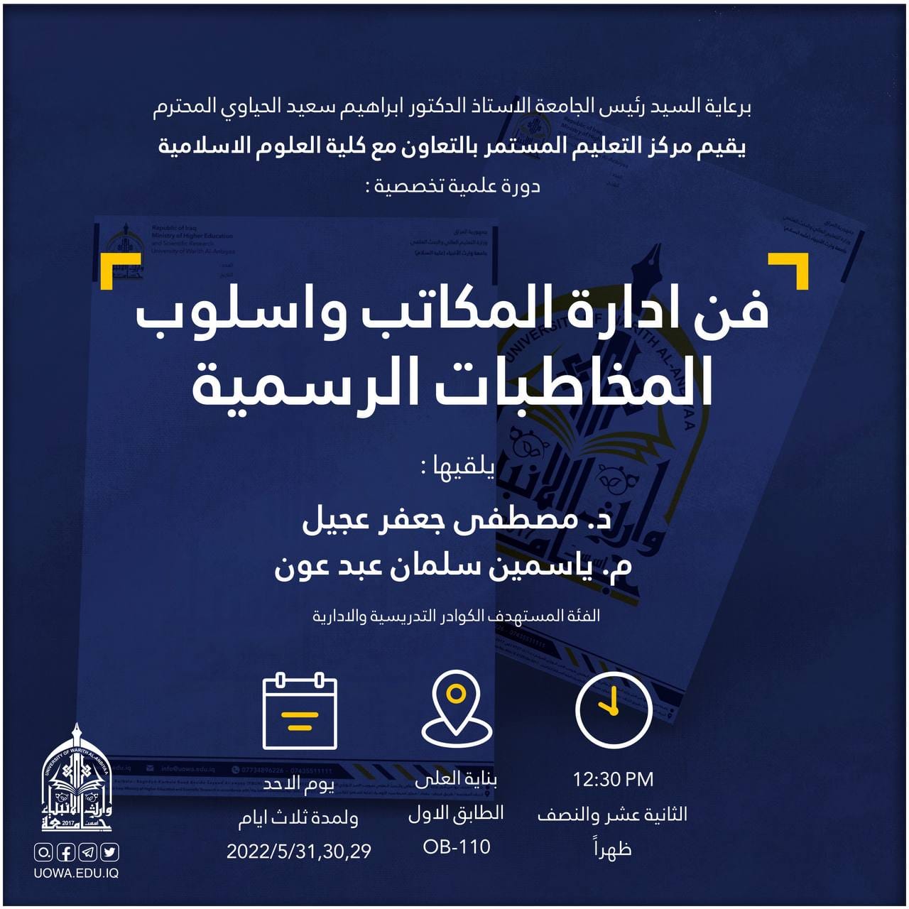 برعاية رئيس الجامعة الأستاذ الدكتور إبراهيم سعيد الحياوي، يقيم مركز التعليم المستمر وبالتعاون مع كلية العلوم الاسلامية