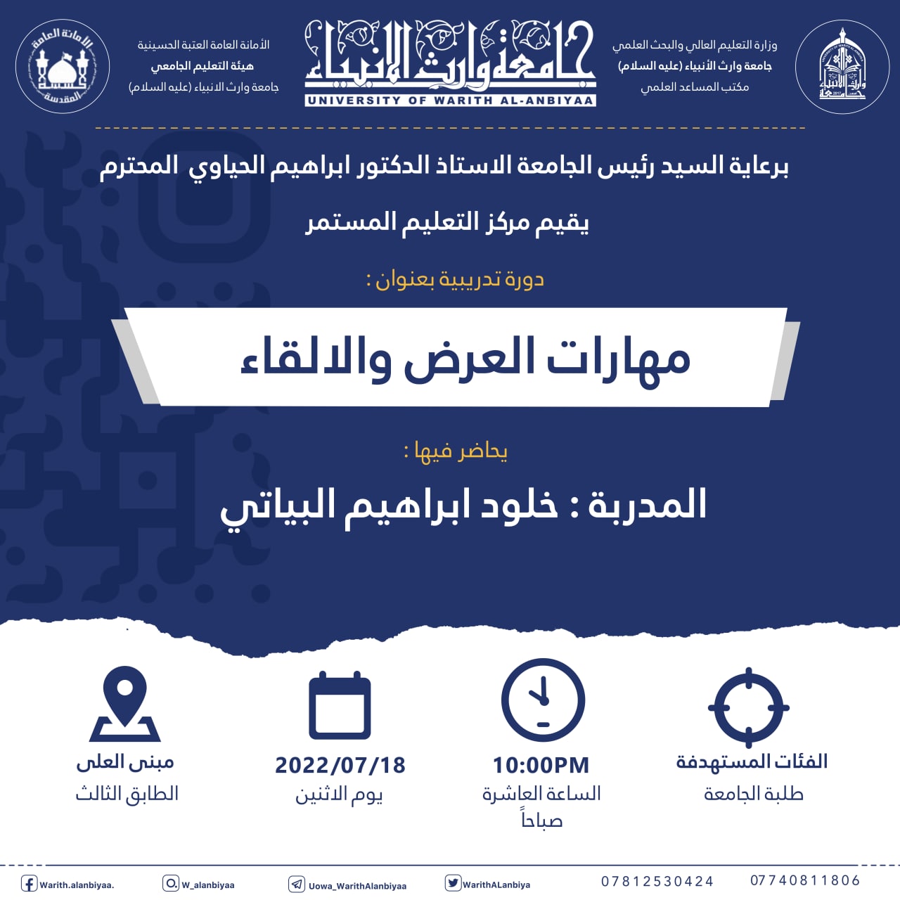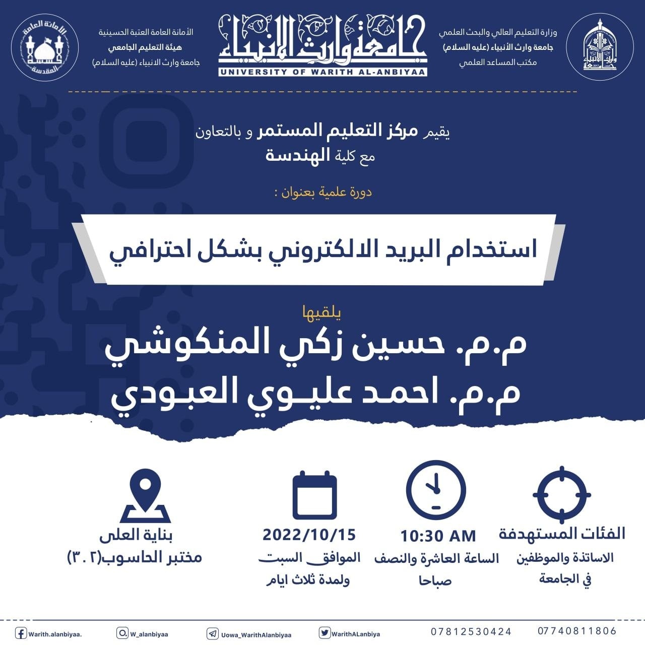 "طلبتنا قادة المستقبل" برنامج تدريبي يطلقه مركز التعليم المستمر في جامعة وارث الانبياء(عليه السلام) لطلبة الجامعة ،ابتداءً من يوم الاحد المصادف 9/10/2022 ،ولمدة تسعة ايام.