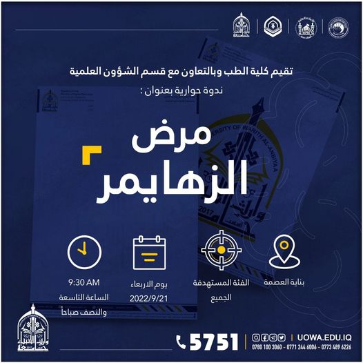 تقيم كلية الطب وبالتعاون مع قسم الشؤون العلمية في جامعة وارث الانبياء (عليه السلام) ندوة حوارية تحت عنوان "مرض الزهايمر".