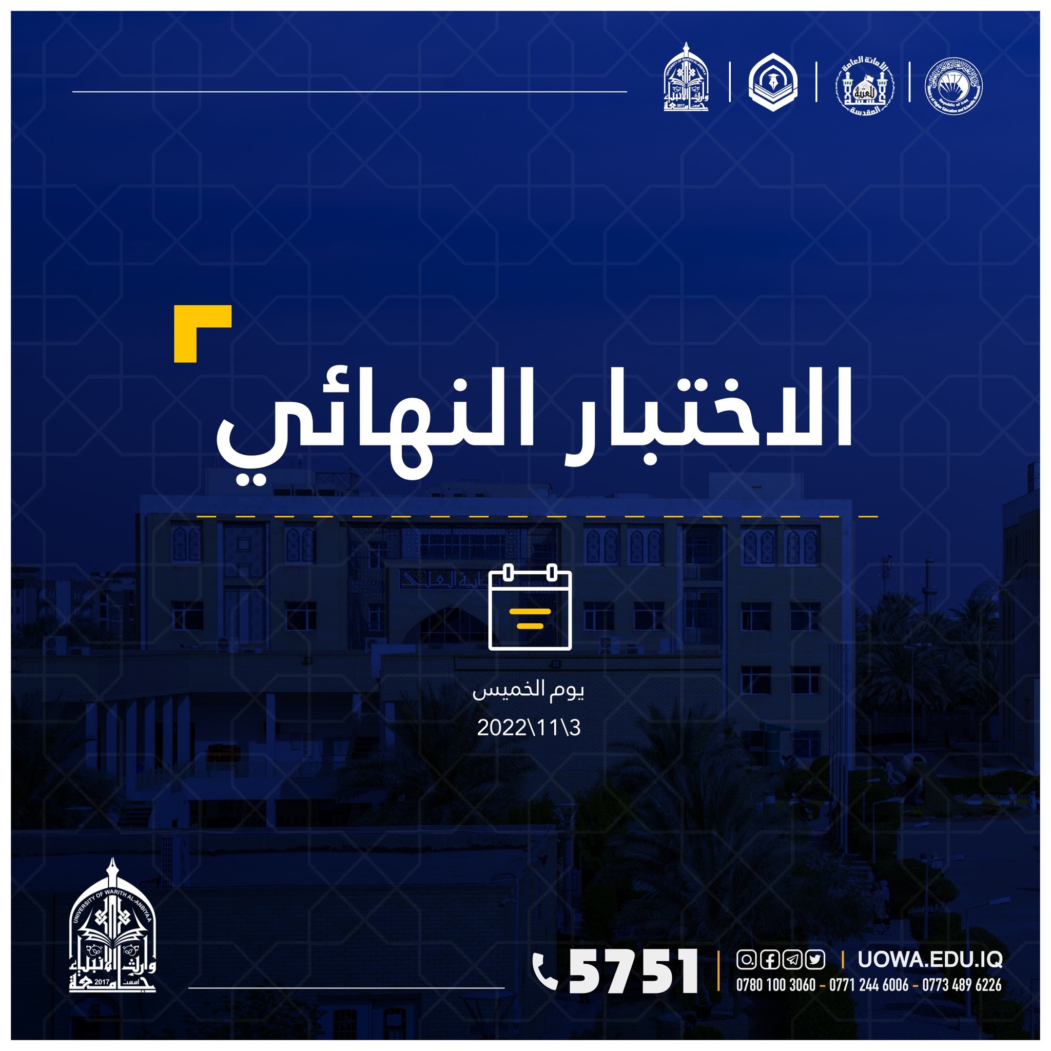 الساعة العاشرة (10:00) صباحاً على قاعة الامام الحسين في مبنى الكلية.