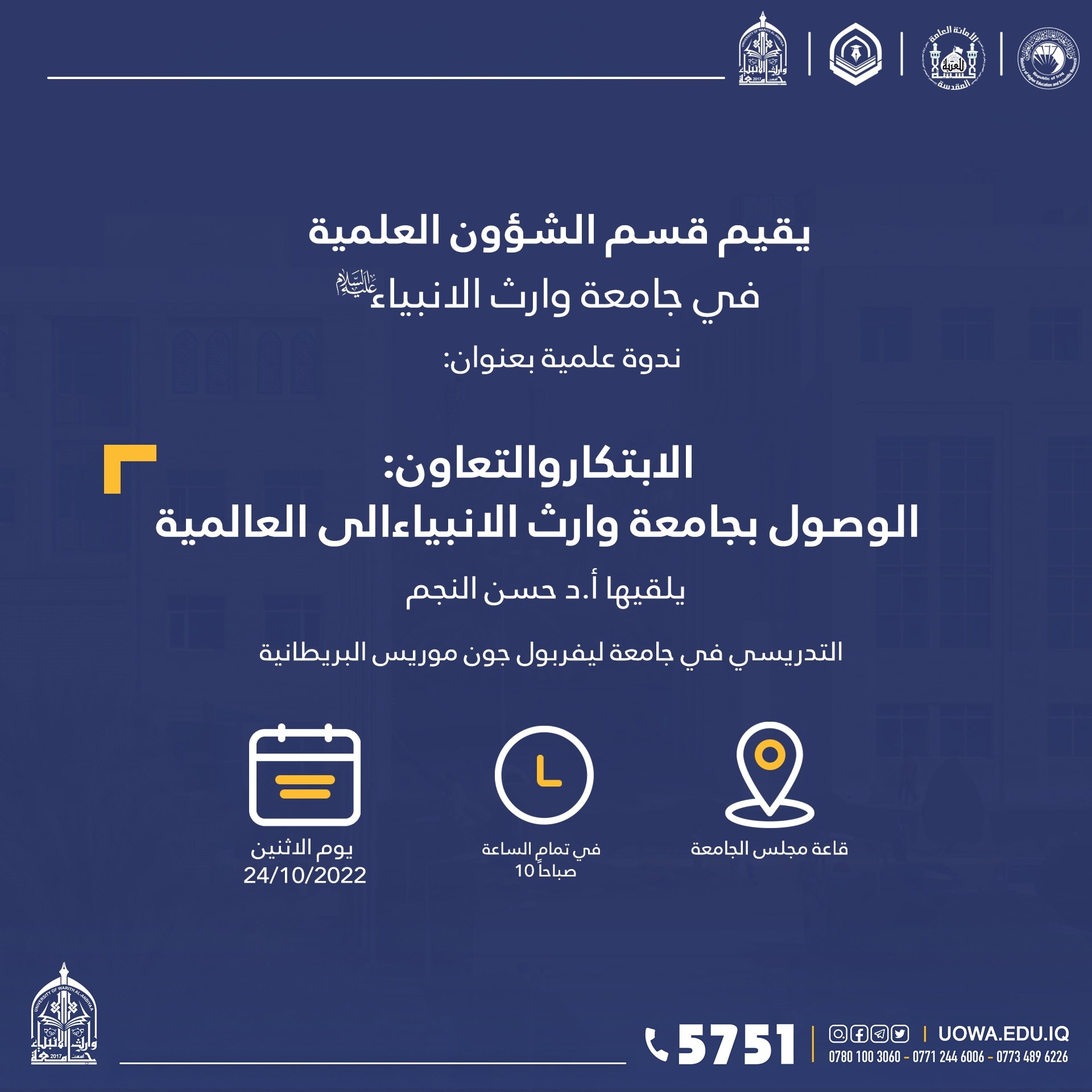 أقام قسم الشؤون العلمية في جامعة وارث الأنبياء (عليه السلام) اليوم الاثنين 24-10-2022