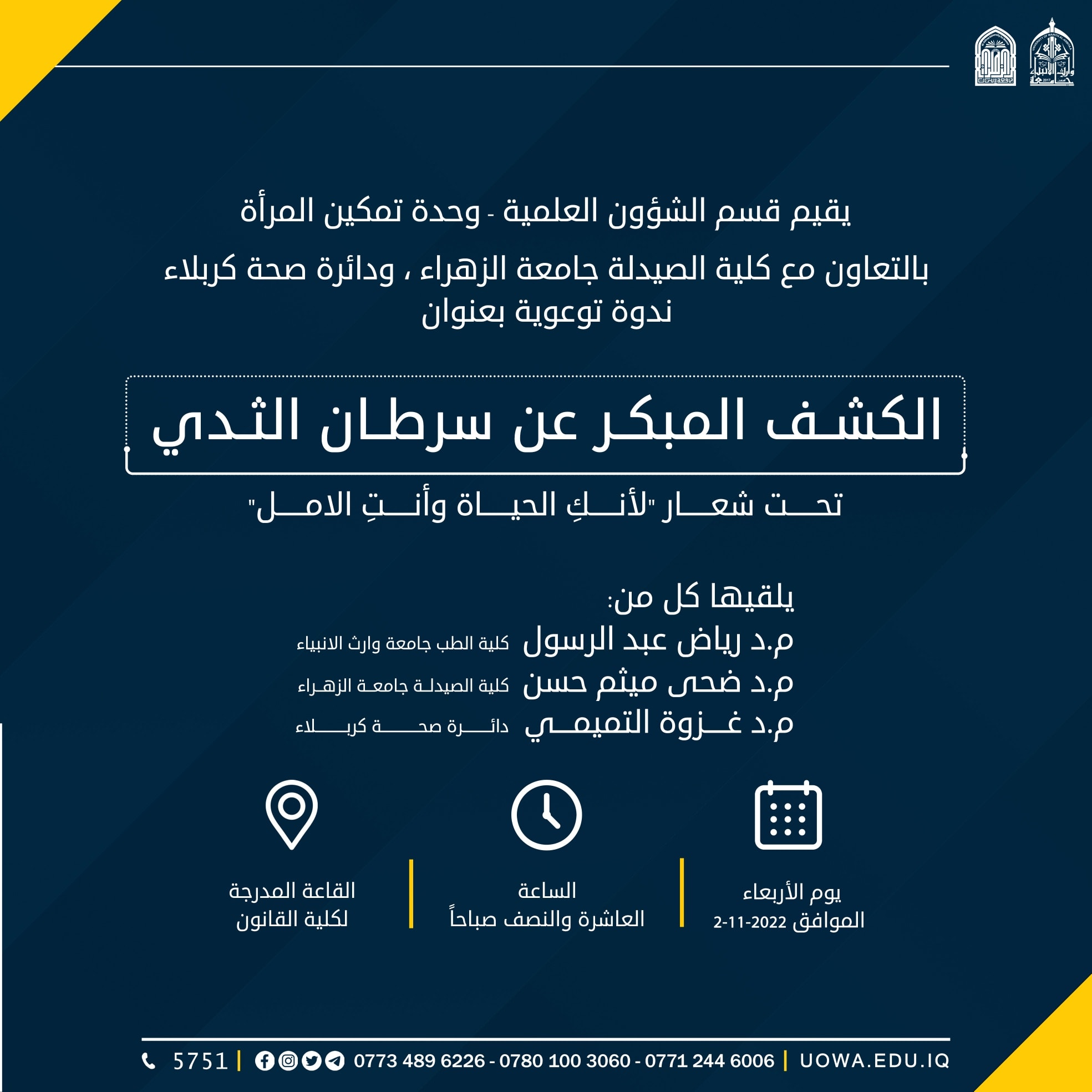 يقيم قسم الشؤون العلمية في جامعة وارث الانبياء/ وحدة تمكين المرأة، وبالتعاون مع كلية الصيدلة في جامعة الزهراء ودائرة صحة كربلاء ندوة توعوية بعنوان "الكشف المبكر عن سرطان الثدي" تحت شعار "لأنك الحياة وأنتِ الأمل" يلقيها مجموعة من الاساتذة المتخصصين، على القاعة المدرجة في كلية القانون