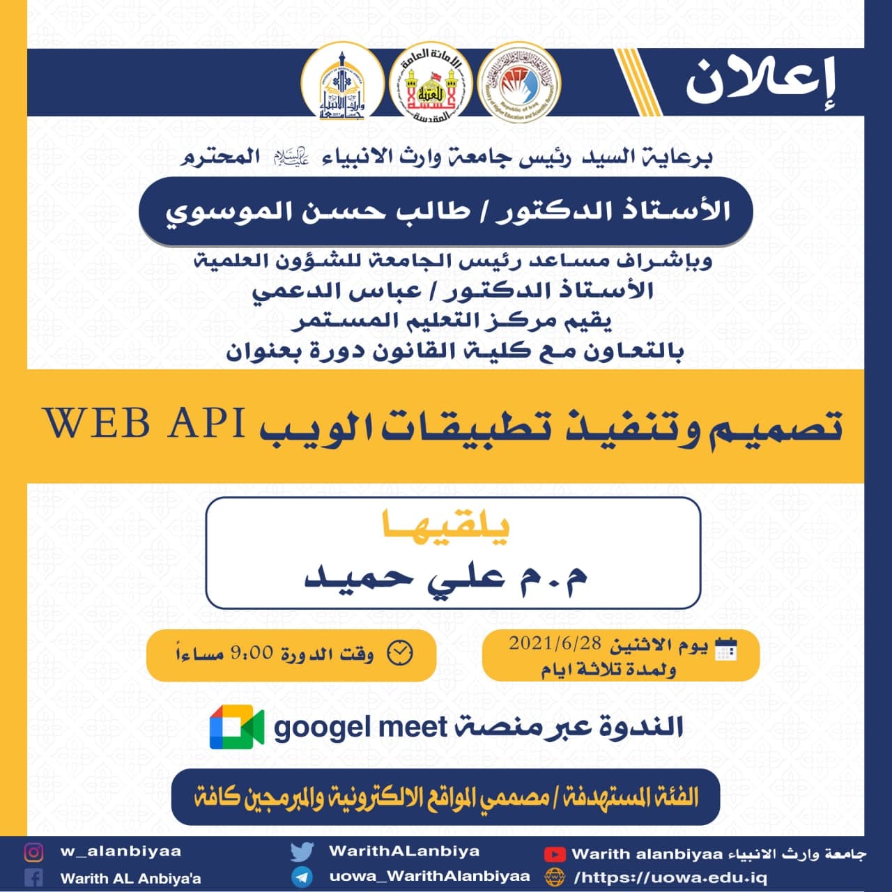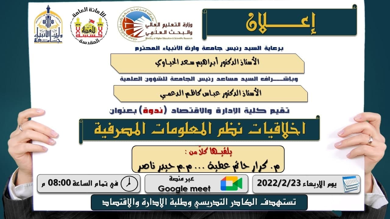 يقيم مركز التعليم المستمر في جامعة وارث الانبياء (عليه السلام) بالتعاون مع كلية الادارة والاقتصاد ندوة علمية بعنوان "اخلاقيات نظم المعلومات المصرفية"، يلقيها ... م. كرار حاتم عطية ، و م.م حيدر ناصر حسين.يوم الاربعاء الموافق 2022/2/23 ، في تمام الساعة الـ 8:00 مساءً ، علماً ان الندوة تستهدف الهيئة التدريسية وطلبة كلية الادارة والاقتصاد عبر منصة Google meet وعلى الرابط الآتي : meet.google.com/wpu-xfsh-frh