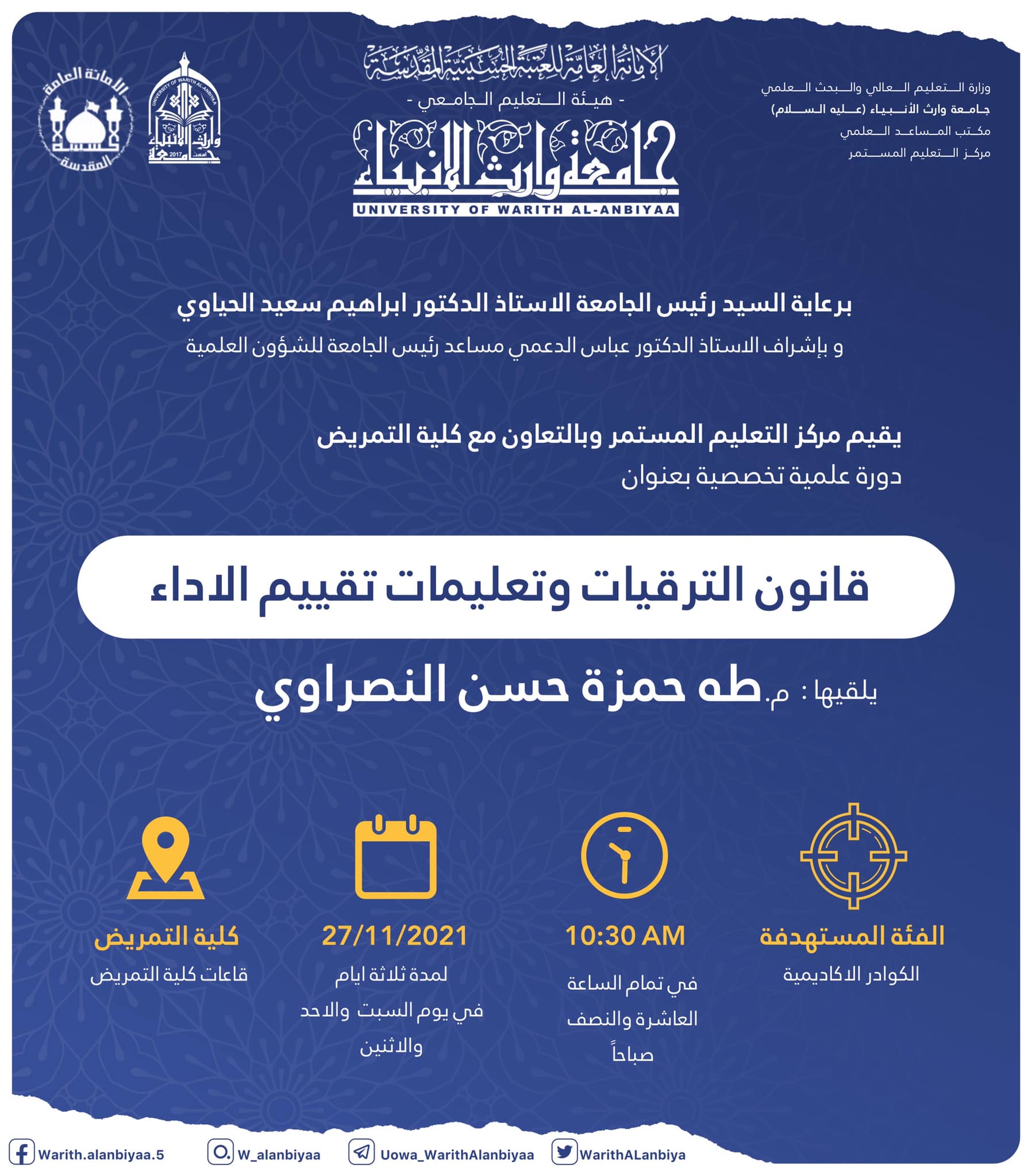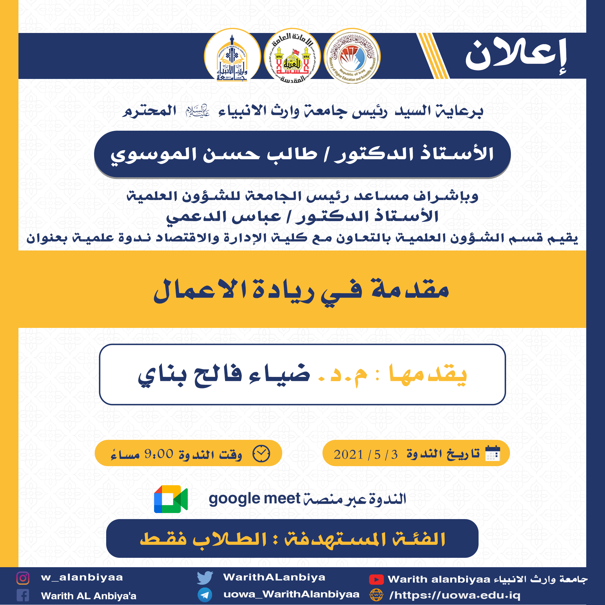 يقيم قسم الشؤون العلمية في جامعة وارث الانبياء(عليه السلام) ندوة علمية إلكترونية عبر منصه كوكل ميت (google meet)ومن خلال الرابط أدناه: meet.google.com/zdu-hvkc-rkk