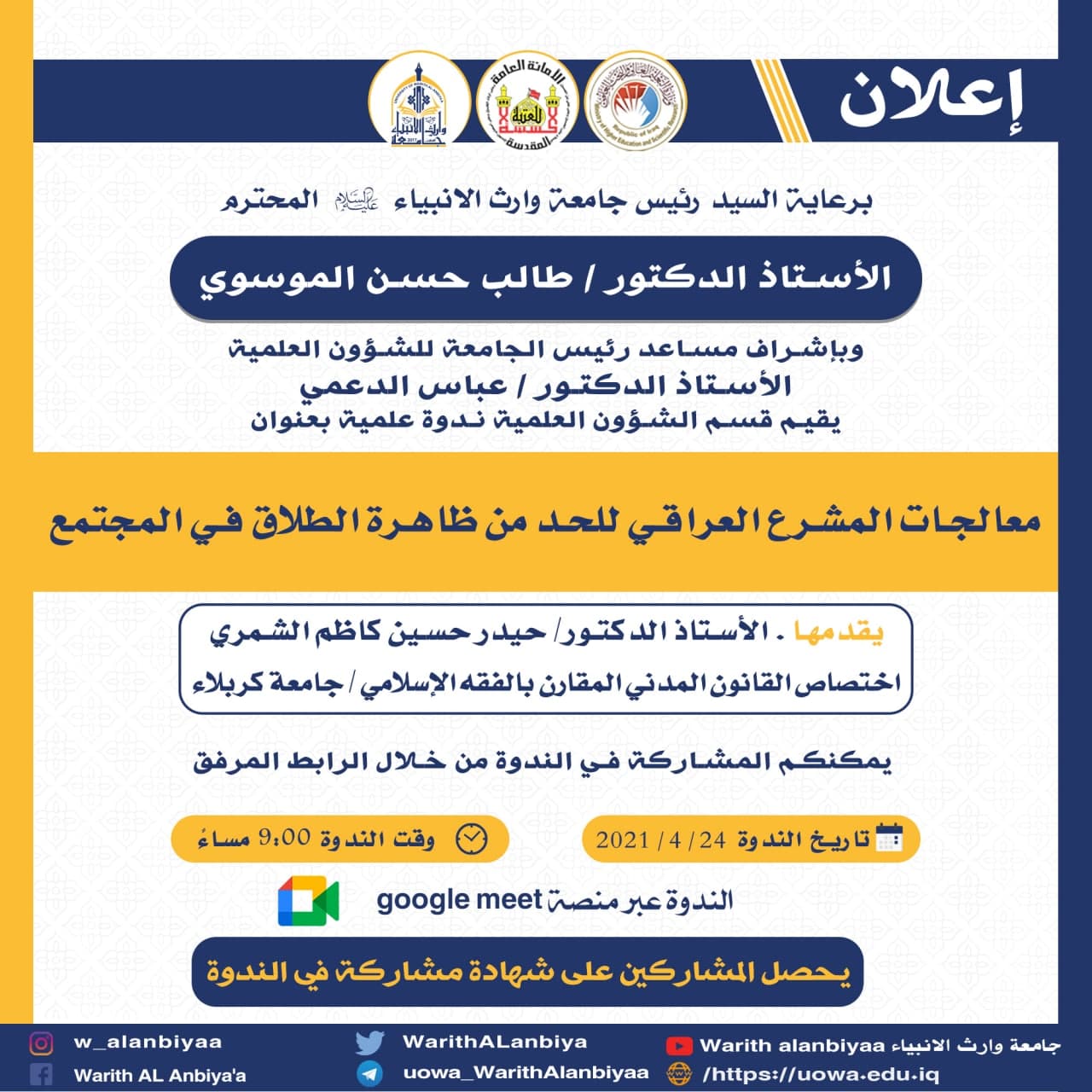 برعاية الأمانة العامة للعتبة الحسينية المقدسة وبحضور ممثلي المؤسسات الحكومية والأهلية وطلبة كليات القانون، اقامت جامعة وارث الانبياء(عليه السلام)بالتعاون مع قسم تطوير الموارد البشرية في العتبة الحسينية المقدسة.ندوة عملية بعنوان "ظاهرة الطلاق في العراق مشاكل ومعالجات".تناولت الندوة دراسة هذه الظاهرة بأبعادها القانونية والقضائية والشرعية والاجتماعية إذ طرحت الندوة رؤى تشريعية للحد من هذه الظاهرة، كذلك معالجات اجتماعية وشرعية وقضائية، والقضية بحاجة إلى تكاتف مجتمعي، والدور على الحكومة من خلال اصدار تشريعات للحد من هذه الظاهرةوهناك مساعي لرفع المقترحات والتوصيات التي خرجت بها الندوة الى مكتب ممثلية البرلمان العراقي في كربلاء المقدسة تقترح فيها نصوص قانونية لإيجاد تعديل على قانون الأحوال الشخصية.