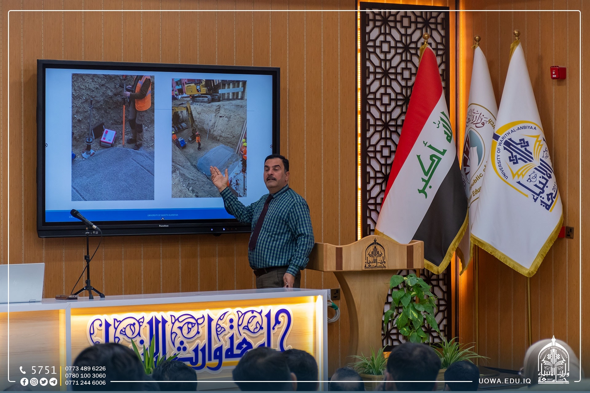 The Department of Civil Engineering, in collaboration with the Department of Scientific Affairs at the University of Warith Al-Anbiyaa (Peace Be Upon Him), organized a scientific seminar titled "Modern Construction Technology Using Hydraulic Jacks Systems Rapid Bridge Replacement on 5 Days Timelapse." The seminar was presented by Dr. Haitham Hassan Mutab Al-Daami, an expert in the design of steel structures and concrete facilities from the University of Babylon.