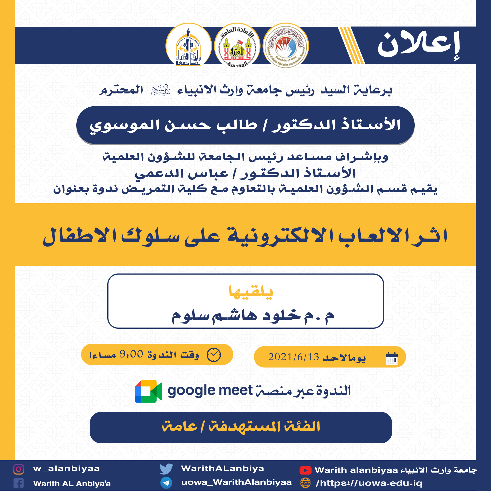 The department of scientific affairs in Warith Al-anbiyaa University, in cooperation with the college of nursing holds a scientific symposium on “the effect of electronic games on children’s behavior”.