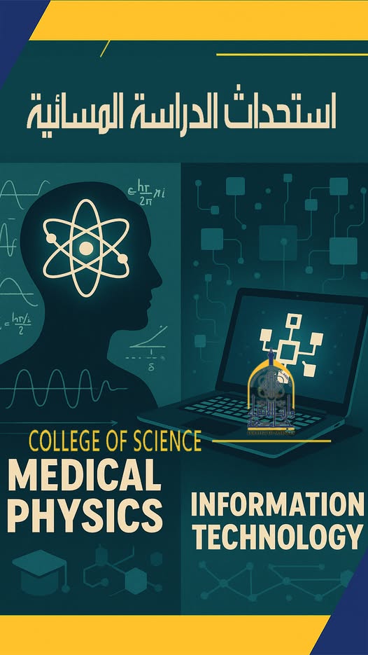 🌟 A remarkable academic opportunity from the University of Warith Al-Anbiyaa (peace be upon him): The College of Science is pleased to announce the introduction of evening studies in two prominent departments: 🔬 Department of Medical Physics 💻 Department of Information Technology