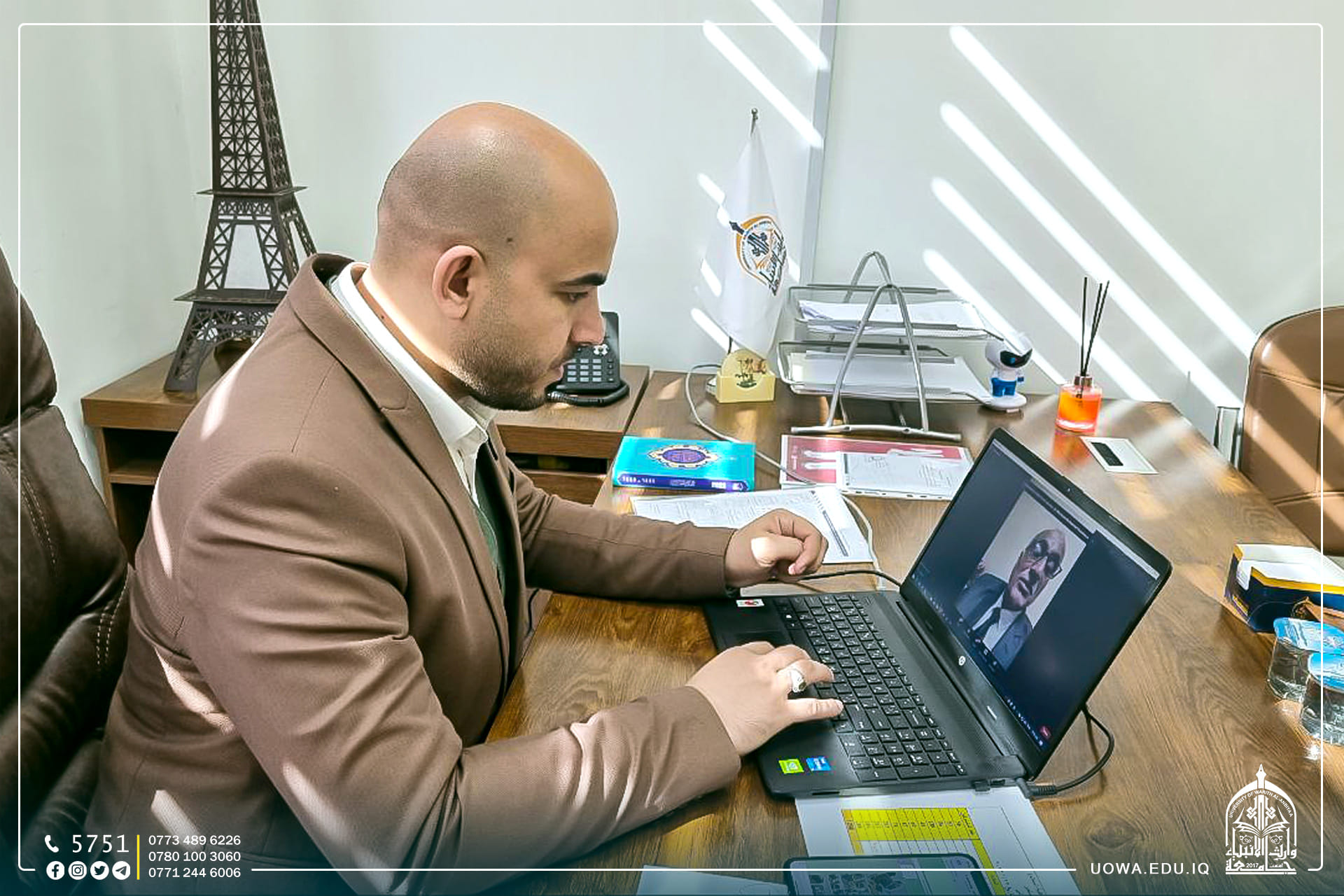 The electronic team of the "Scientific Supervision and Evaluation Authority" was briefed on the progress of the first semester exams in the colleges and departments of the university. The delegation met (via the Zoom platform) with the scientific assistant, Prof. Dr. Abbas Al-Daami, and the Director of the Continuing Education Center, Dr. Haider Al-Ghanmi, who spoke saying: With the participation of 1290 students in today's exams, the ministerial team inspected the examination halls and examination committees, and expressed its great satisfaction and admiration for the scientific capabilities provided by the university for the success of the semester exams.