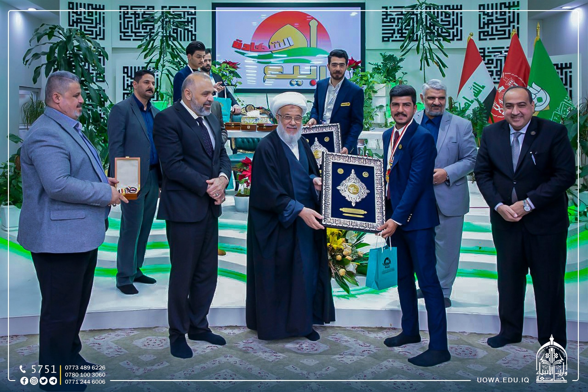 On the sidelines of the "Spring of Martyrdom Festival", Sheikh Karbalai honored, His Eminence, and in the presence of the President of the University, Prof. Dr. Ibrahim Al-Hayawi and Prof. Dr. Waqid Al-Musawi, Dean of the Engineering College, within the idea of honoring creative Iraqis (A group of graduates of Warith Al-Anbiyaa University) for their graduation research in the presence of a number of teachers, students and parents. As well as guests of the festival from outside Iraq whom are fascinated by the kind of research during the presentation that rises to the level of graduate studies.