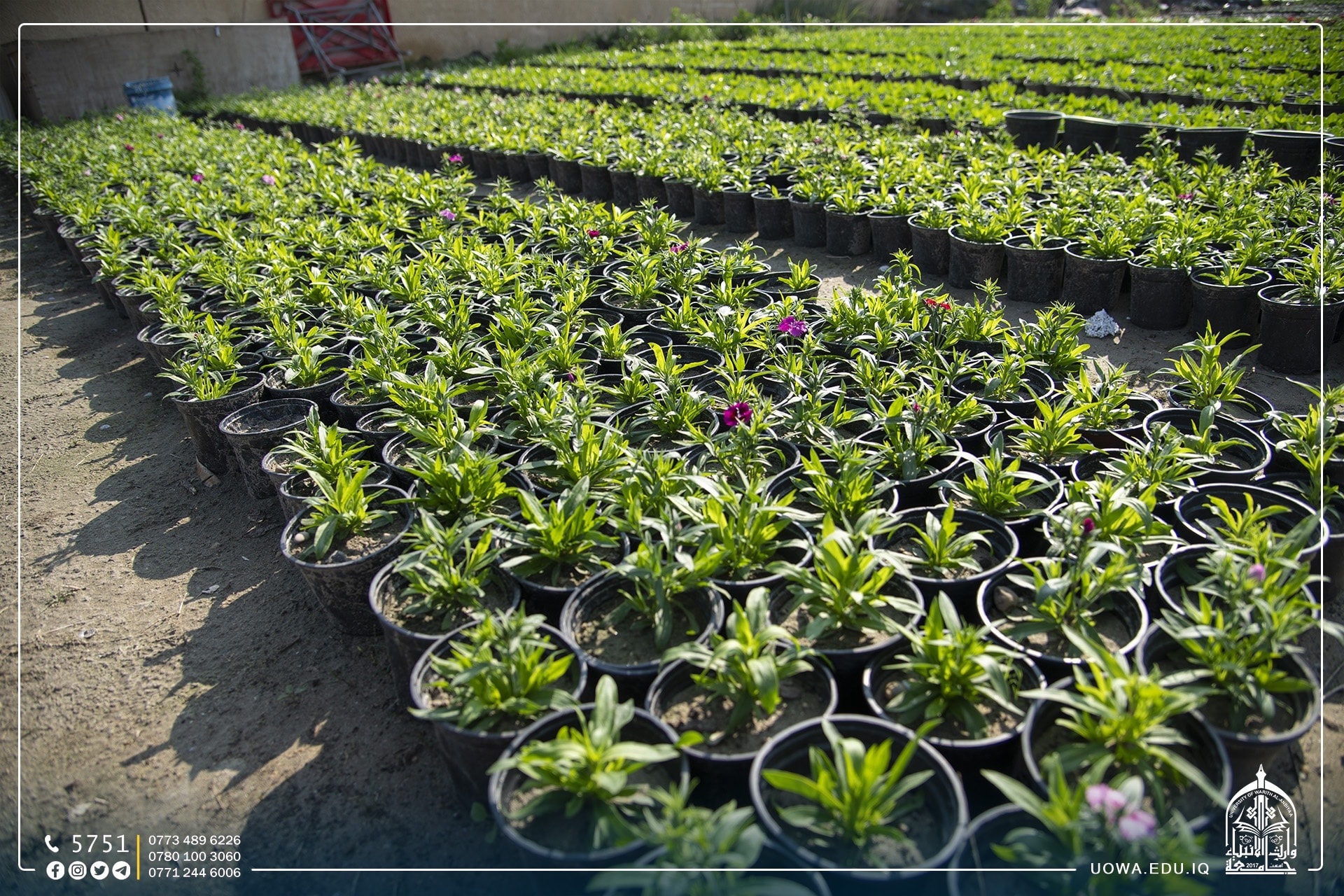 An illustrated part of the Nurseries of Warith Al-Anbiyaa University (peace be upon him), which was established by the Ornamental and Gardening Division in the University Diwan Department to pay attention to green spaces and sustain them, as they have all seasonal and permanent plantings, and rely on modern irrigation methods to reduce water consumption, as well as adopting crops that do not need large quantities of water.